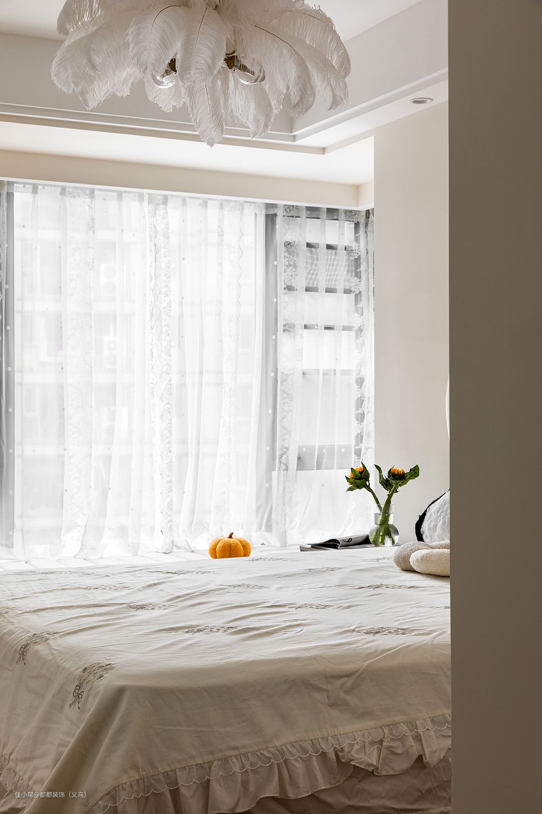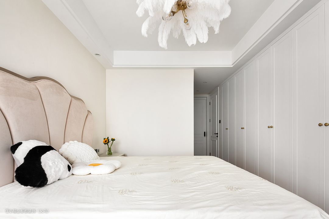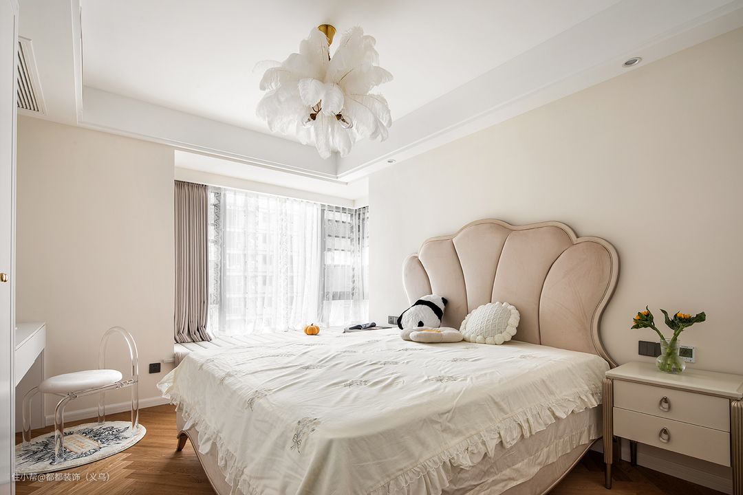 设计师在主卧汇入大面积的奶杏色,与木色地板形成明显呼应,它温情而清醇,神秘中带着些许明朗,似幽深林间漫溢出的一抹芳香,在简约格调中自在畅游。 卧室背景墙以质感十足的奶茶色涂料做底,上方的羽毛灯照夜晚照亮床头一角,组成一个温馨十足又耐人寻味的居心之所,靠窗床头摒弃笨重床头柜,放上细脚矮柜和向日葵,轻松打造休闲趣味。
