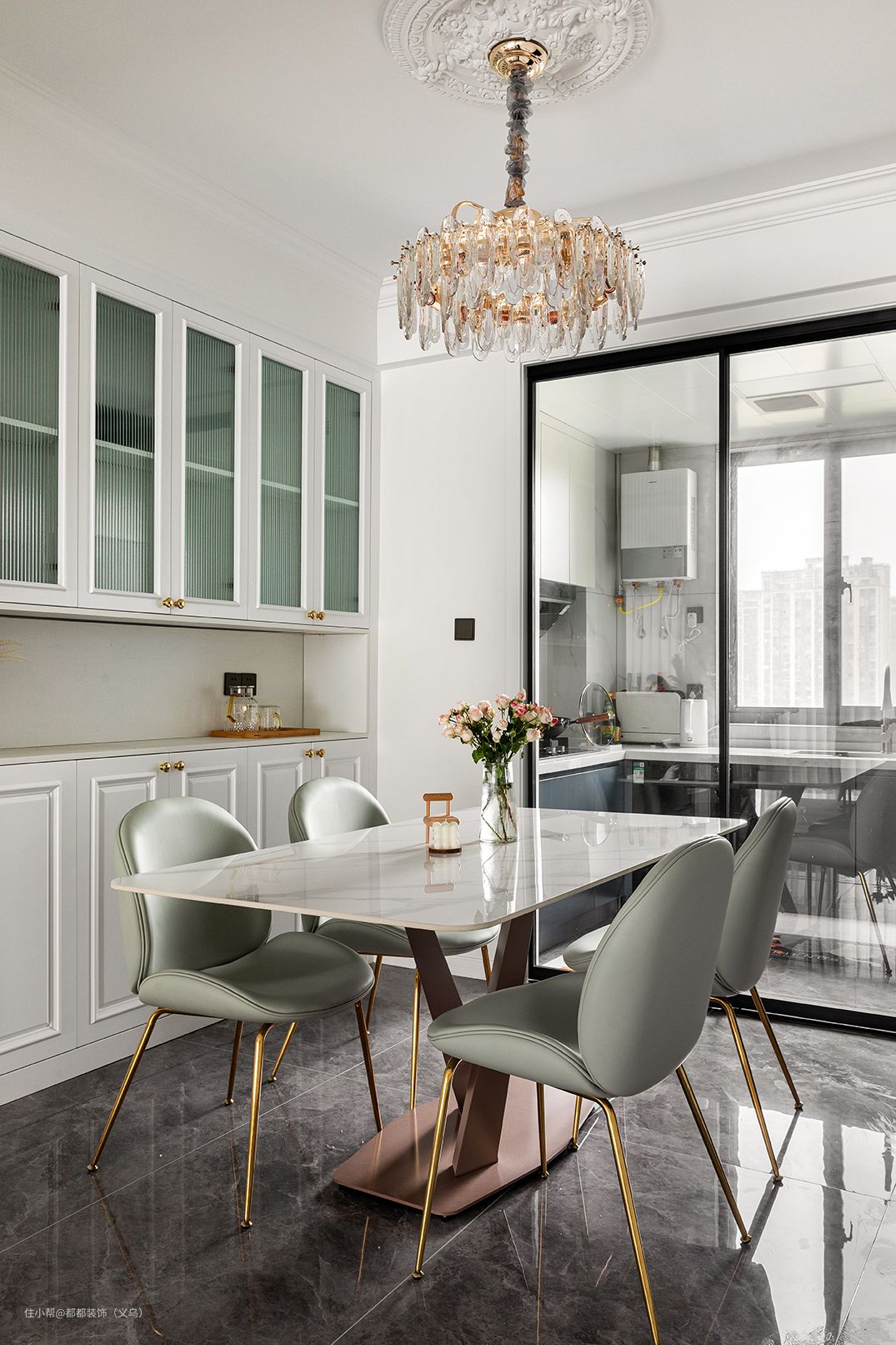 方形餐桌一家四口围坐用餐也不显拥挤,青草绿餐椅搭配金色椅脚,欧式风情满溢空间;上方水晶吊灯质感纯净,光线洒落,灯罩流光闪耀,浪漫精致不言而喻。 餐桌旁定制储物柜,上饰白色线条纹理,视觉上保持干净又不显单调呆板,局部柜体设计为长虹玻璃门方便拿取物品,搭载暖光系统变身小小展示区。