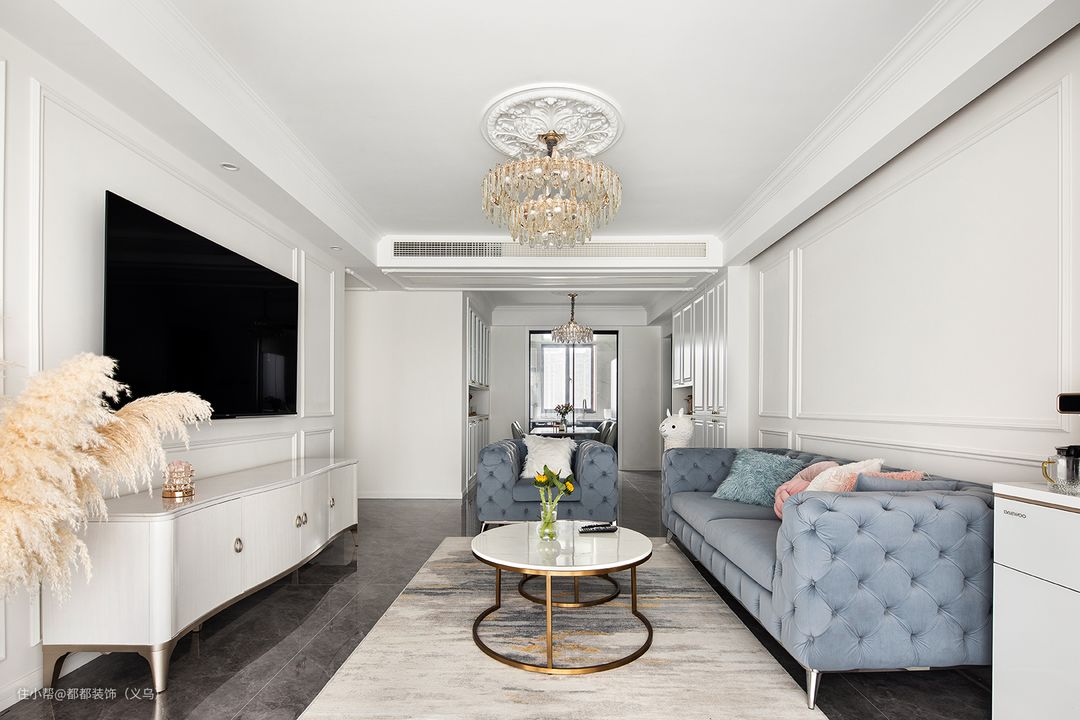 沙发背景墙依旧以PU线条划分区域,在自然光晕染下,空间文艺气质复兴,蓝色沙发丰润饱满为空间平添一抹温柔,细腻奶油白作为主色调,营造出清雅写意的空间氛围。 蓝色古典的沙发,加上低调不失品味的金属茶几,每一处都是不可复制,拥有独特的气质。