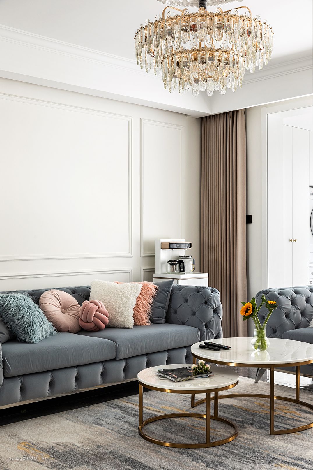 客厅美式韵味浓郁,复古沙发、精致PU线条、浪漫吊灯、蓬松毛毛抱枕,共同构筑了一个时尚兼具复古感的优雅空间。 “大海深处有一家蓝色的便利店,贩卖着蓝色的海浪。”地面通铺了灰色纹理大理石瓷砖,大面积落地窗搭配上卡其色窗帘,让室内光线充足,奶蓝色沙发色系温馨放松仿佛散发着美式独有阵阵的幽香。