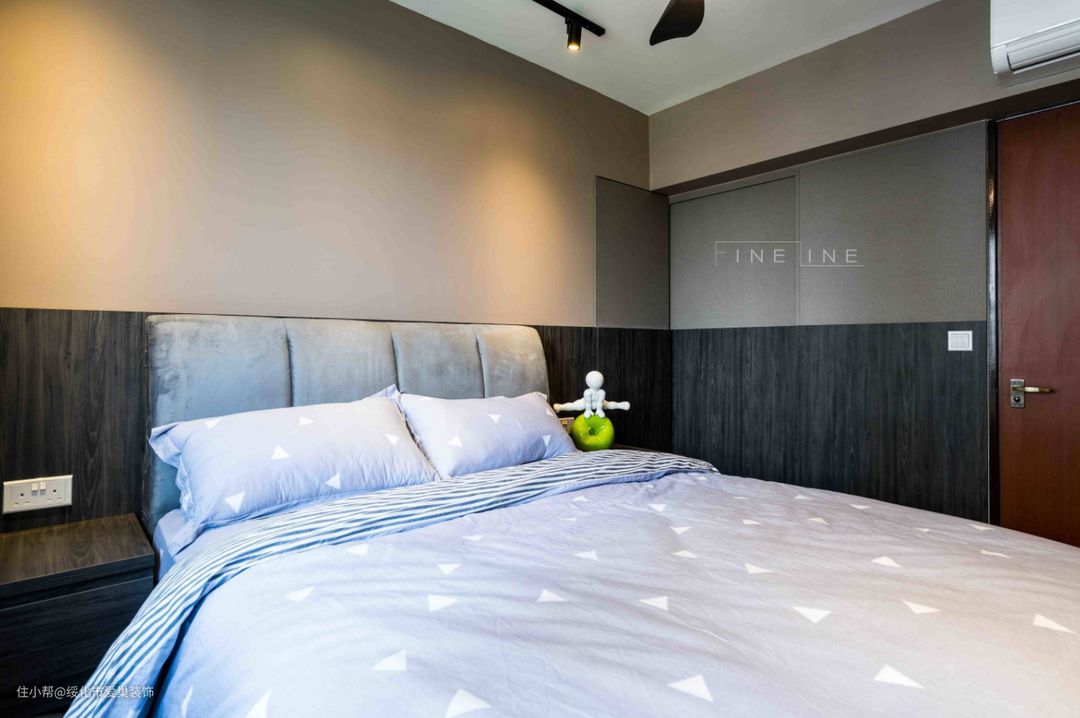 卧室这里墙面用香槟色的漆面涂装,墙面下半部分整体用深色胡桃木板做护墙板,层次感突出,并且这里定制的是嵌入式的衣柜,同样护墙板的设计延伸到柜门上形成整体。