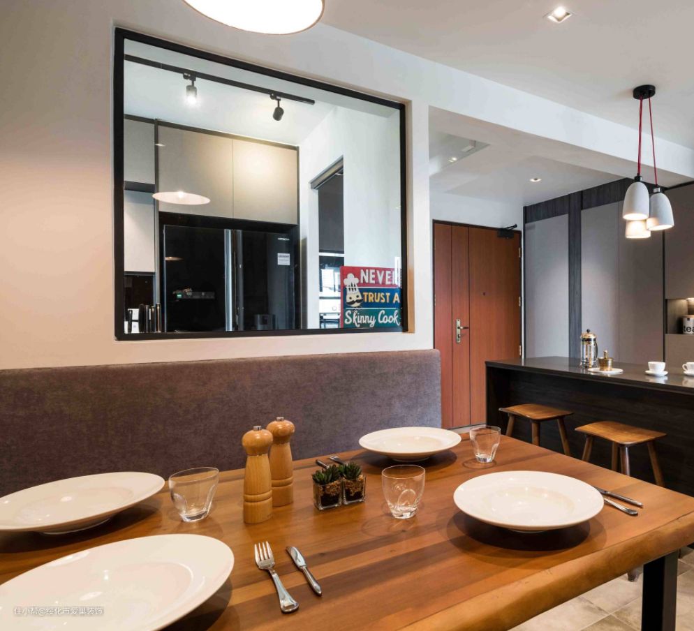 餐厅这里采用卡座与椅子搭配,使用起来灵活性强,并且能容纳多人就餐。实木的餐桌给人很一些复古的感觉。