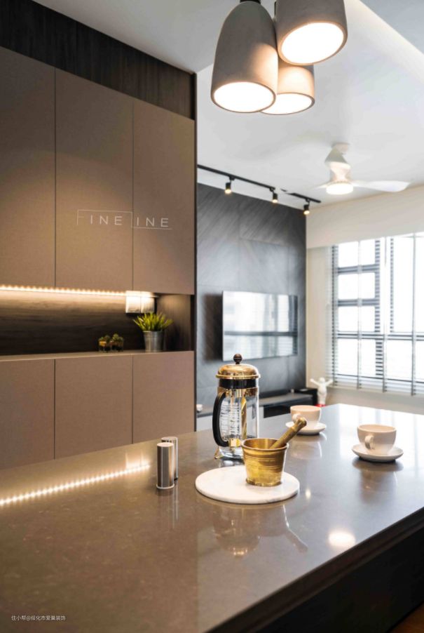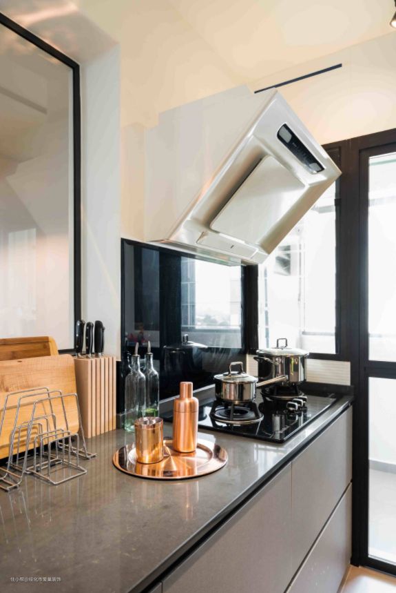 厨房做得比较派偏西式,巨大的橱柜让这里拥有足够的储物空间,所以上方我们不需要做吊柜,给头部留下更加宽敞的活动空间。