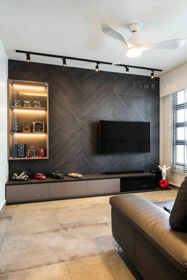 客厅这里我们定制了一块超大的实木背景墙,采用矩形拉丝花纹胡桃木进行不规则方式拼接,整体看起来设计感很强,侧边做镂空展示台,搭配灯带营造氛围,下方为半空式落地电视柜,香槟色的配色显得非常具有质感。电视背景墙上方用轨道射灯从不同角度营造光晕,体现墙面质感,中间用巨大的吊扇灯来提供照明和装饰。