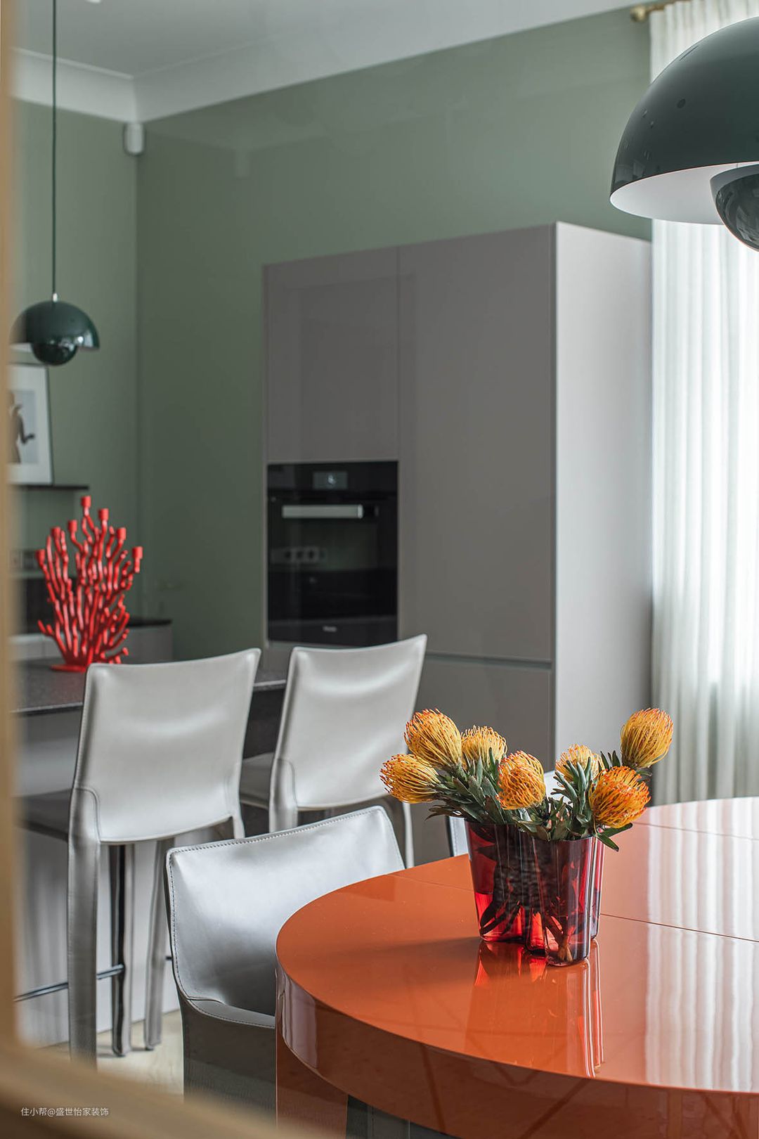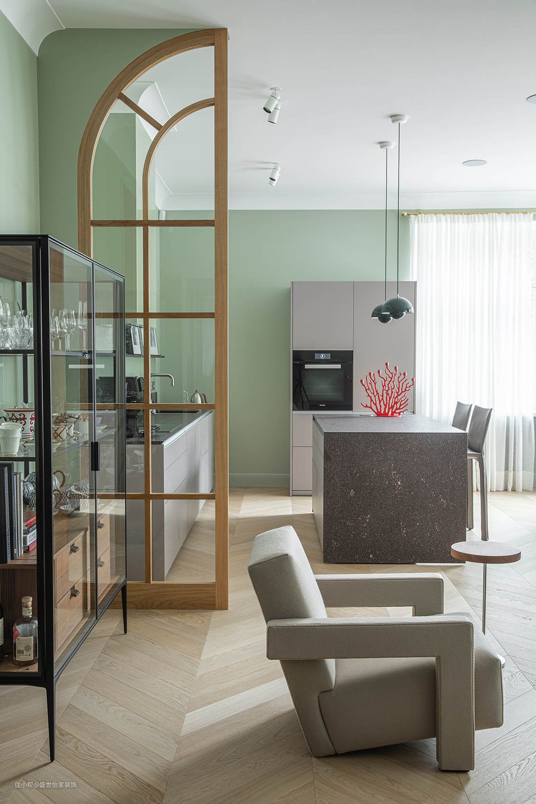 打掉了厨房两边的墙体,用圆弧透明玻璃门做装饰,全屋使用淡青色为主色,明亮大气