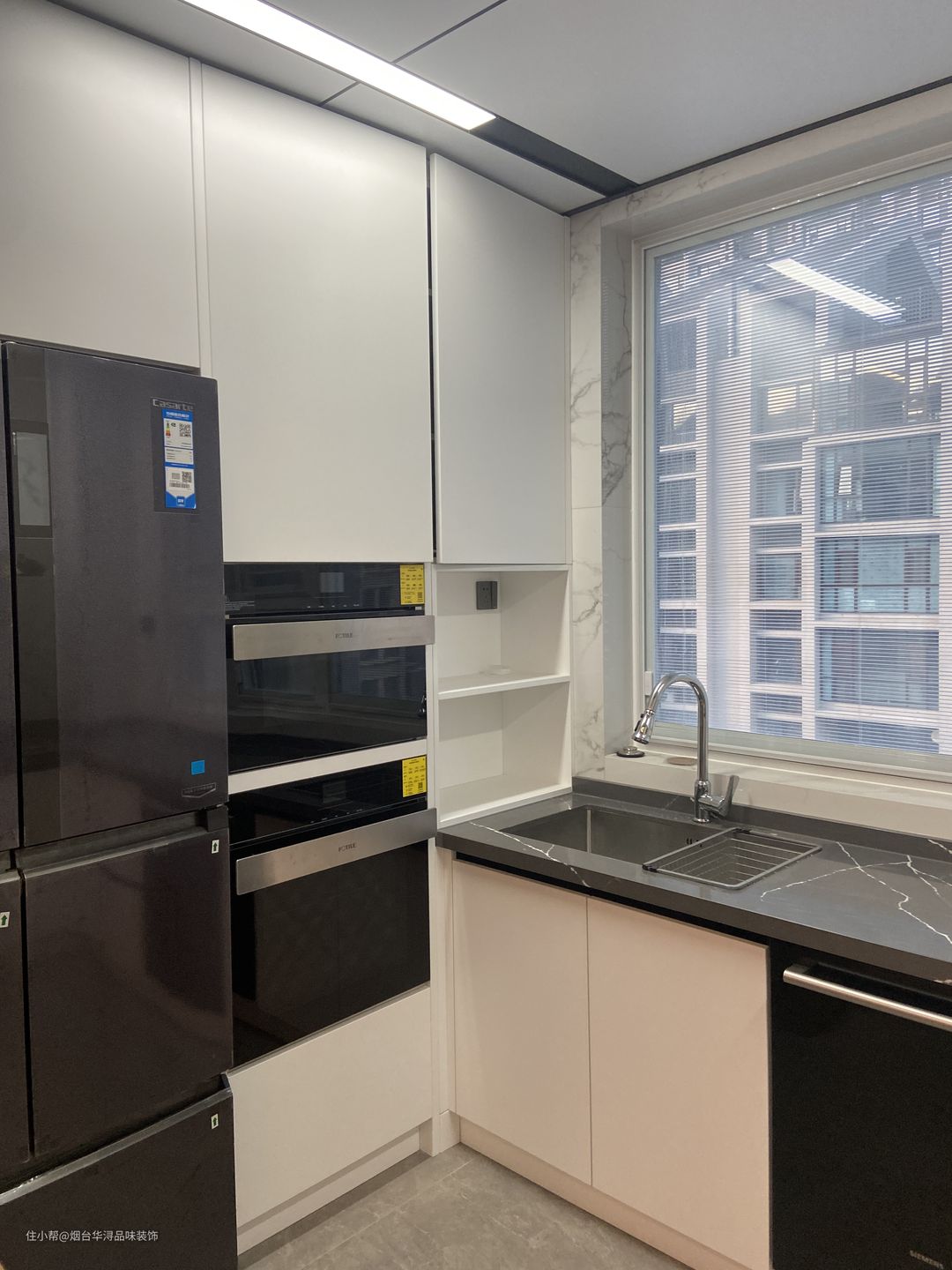 因为业主朋友平时酷爱烹饪,特别喜欢一些爆炒,浓油赤酱的菜系,设计师就建议将厨房作为一个封闭空间来使用,在推拉门的选择上采用了极窄的推拉门(小贴士:建议大家选用吊轨式的推拉门,不爱藏灰哦)厨房的布局采用了收纳功能最强的U字型厨柜的设计,冰箱采用了嵌入式的整体暗藏蒸箱烤箱,洗菜切菜炒菜整个动线还是非常流畅的。