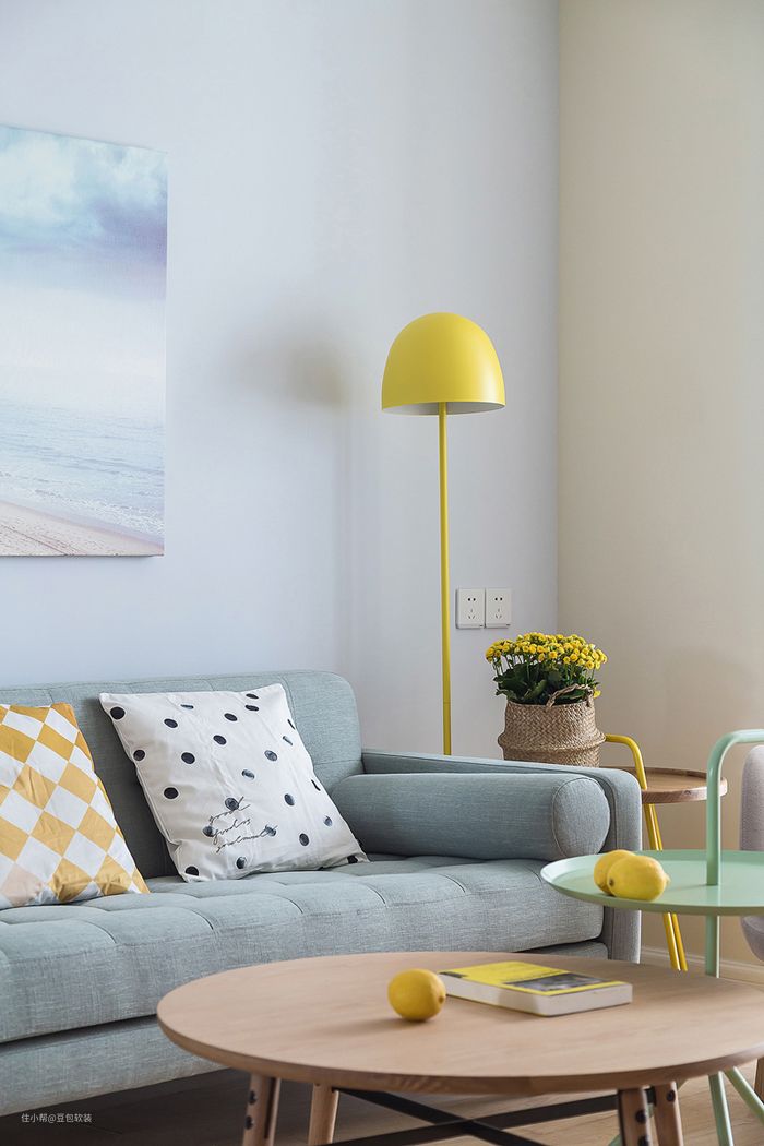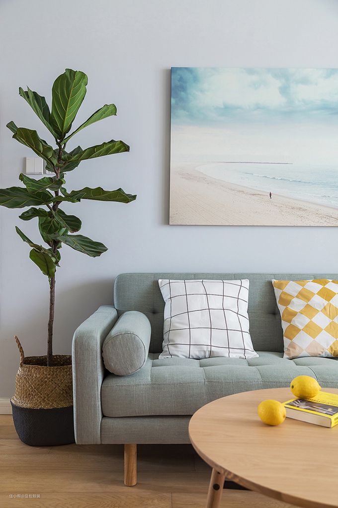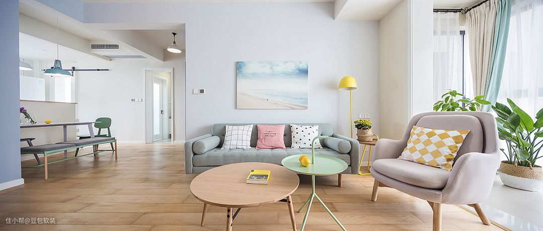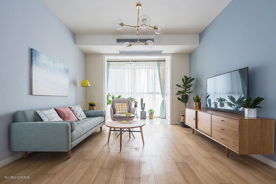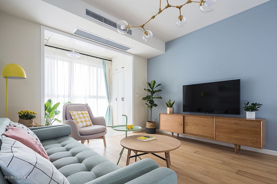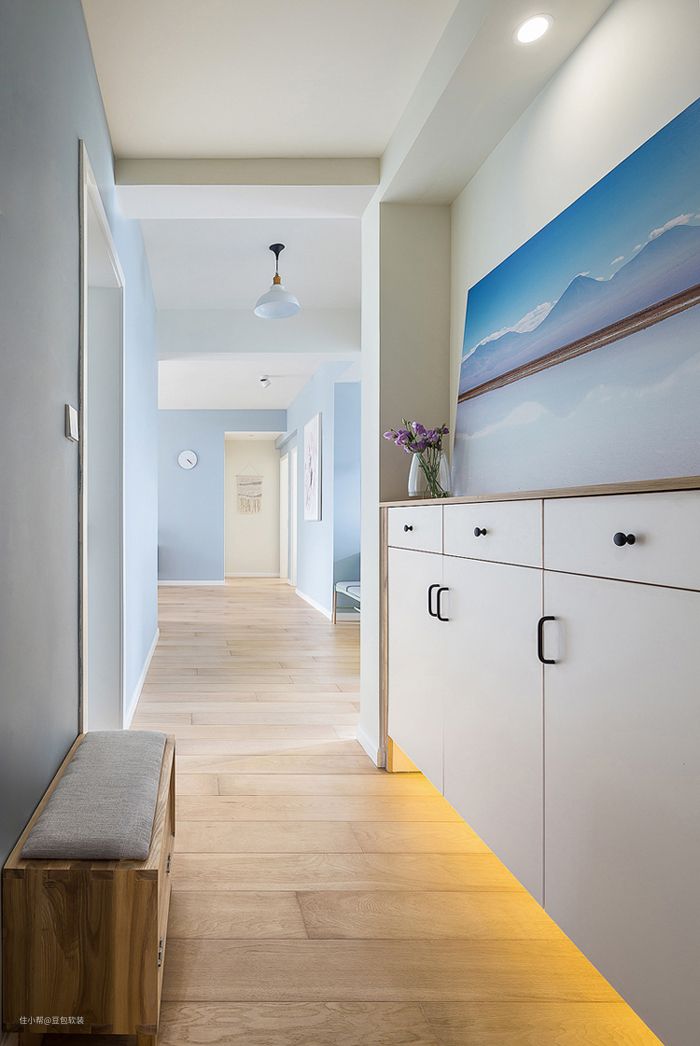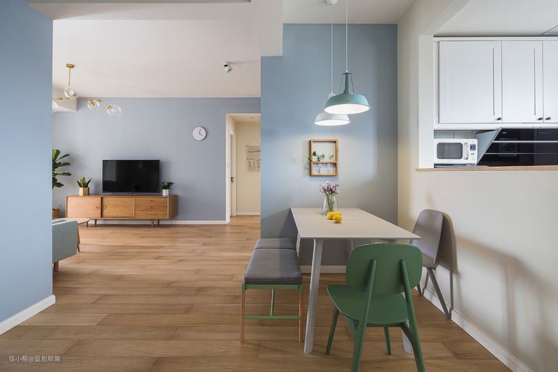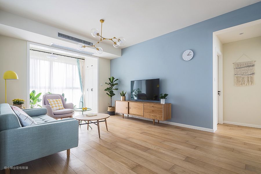 1、入户门左侧的玄关走廊,空间比较窄做嵌入式的悬空鞋柜底部镂空20cm,底部加上隐藏灯带的作用,用来换鞋更便捷,高度只有60cm,空间不显得压抑 2、客厅蓝色为主的背景墙,搭配木质的茶几、电视柜,给人带来清新自然 3、客厅与阳台之间将非隔断墙打通,将阳台左侧做收纳柜设计,在搭配各种绿植,给整个客厅自然气息 4、在客厅与餐厅之间已走廊为划分区域,公共区域通铺木质地板,温馨的木质感加沙发背墙白色,居住起来非常舒服