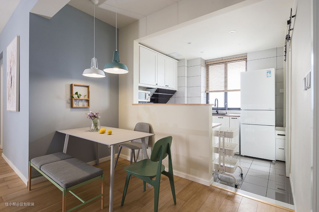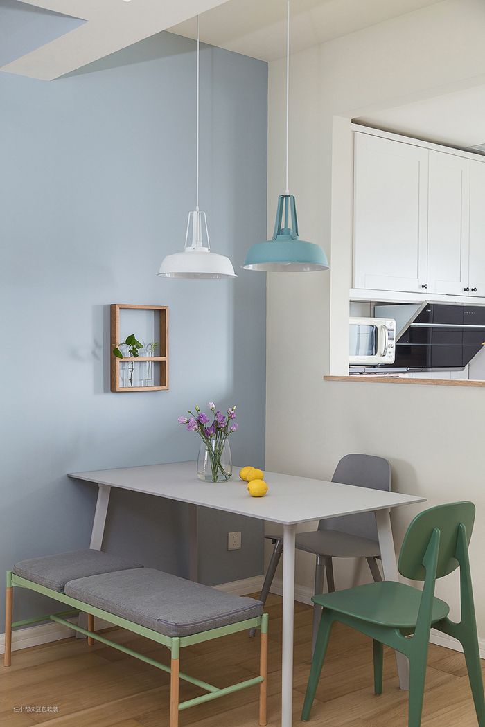 1、厨房内部面积长,做U型布局,将厨房与餐厅之间的隔断打通半墙,让空间明亮兼宽敞 2、餐厅空间较小,用木质的长形桌,搭配简洁的餐桌椅,让空间非常舒适