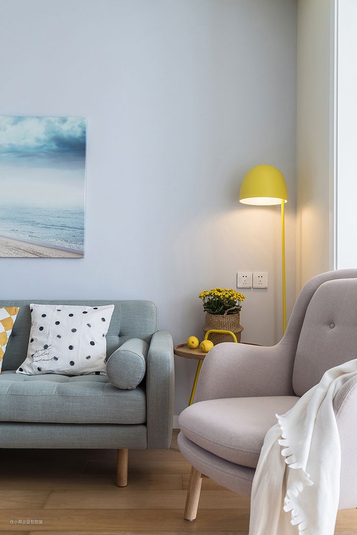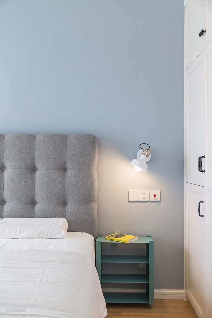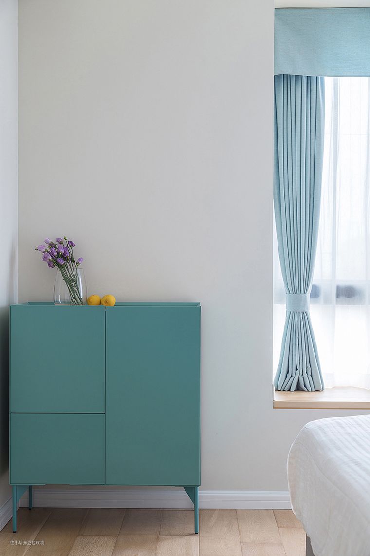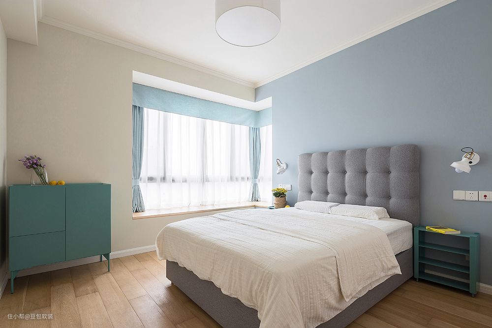 主卧的背景墙用浅灰色的布艺床头,让人更快入睡,房间旁的L型飘窗做额外的休息空间 墙角旁的一个高脚柜做额外收纳,上面摆放的干花、绿植点缀,让卧室变得更美