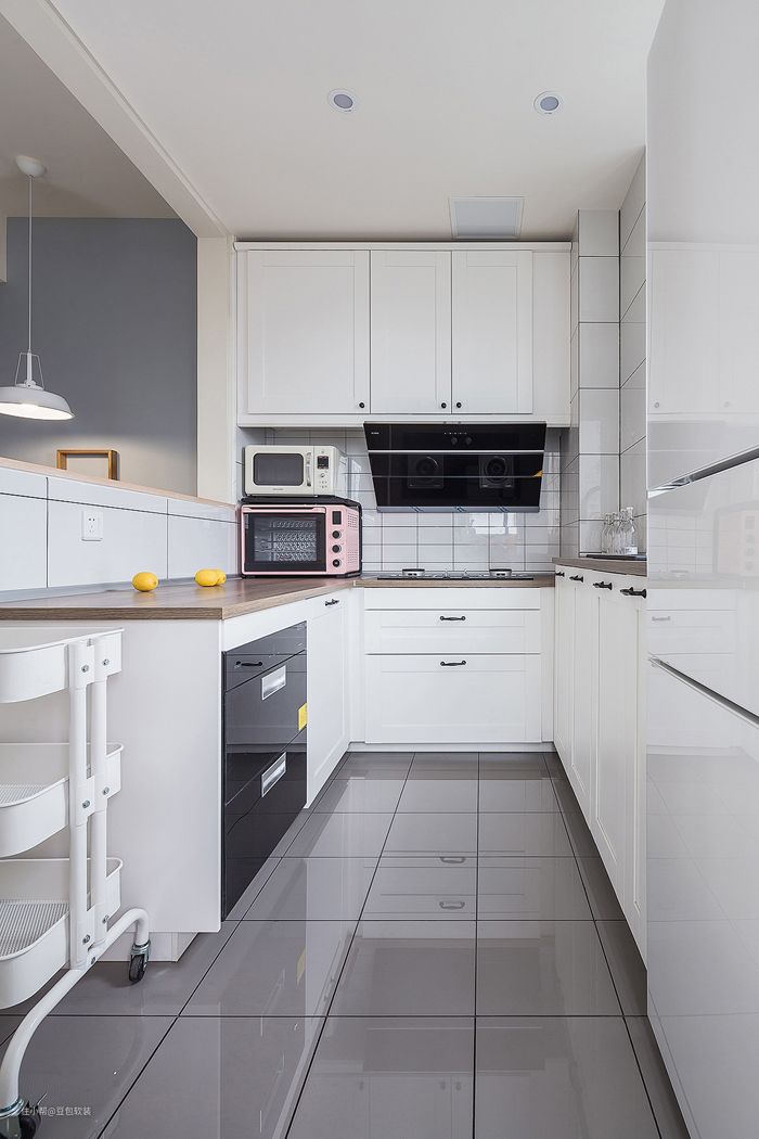 厨房面积只有4m²,U型的橱柜,增加厨房收纳需求,在旁边放冰箱与小推车,符合业主做饭流动线条