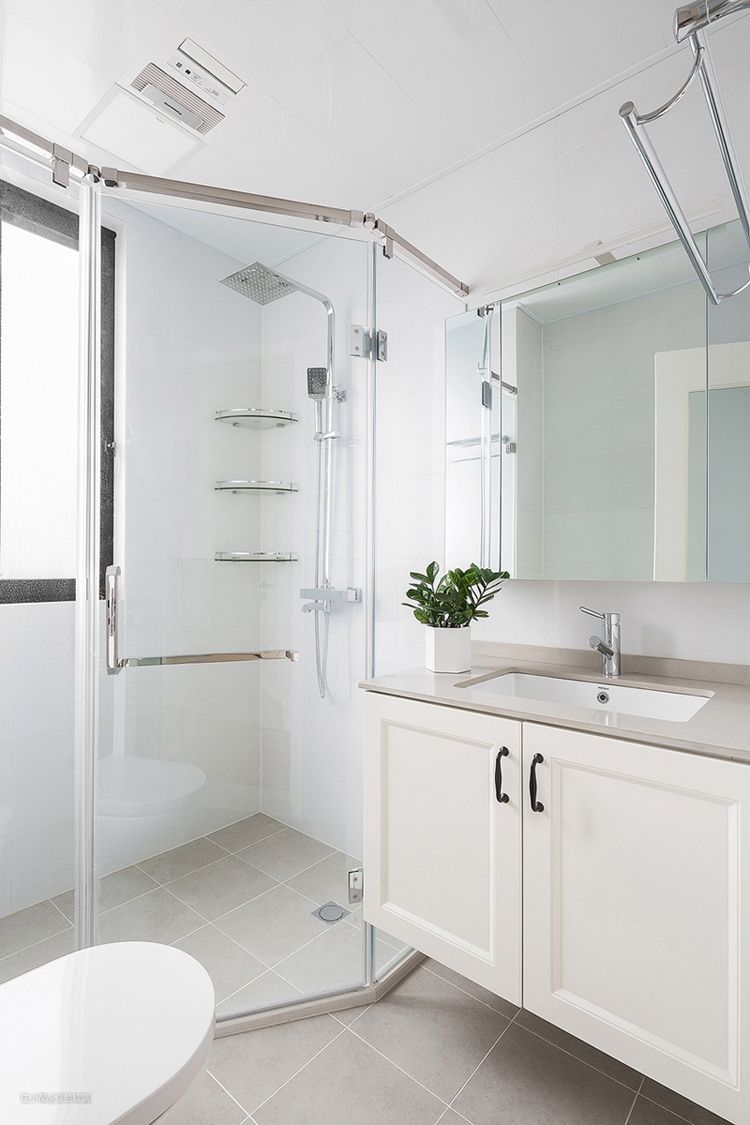 卫生间的沐浴区做在角落里,马桶与洗漱台在两侧旁,悬空的洗漱台与镜柜组合,将空间利用做到最大化,也满足一家三口的洗漱需求