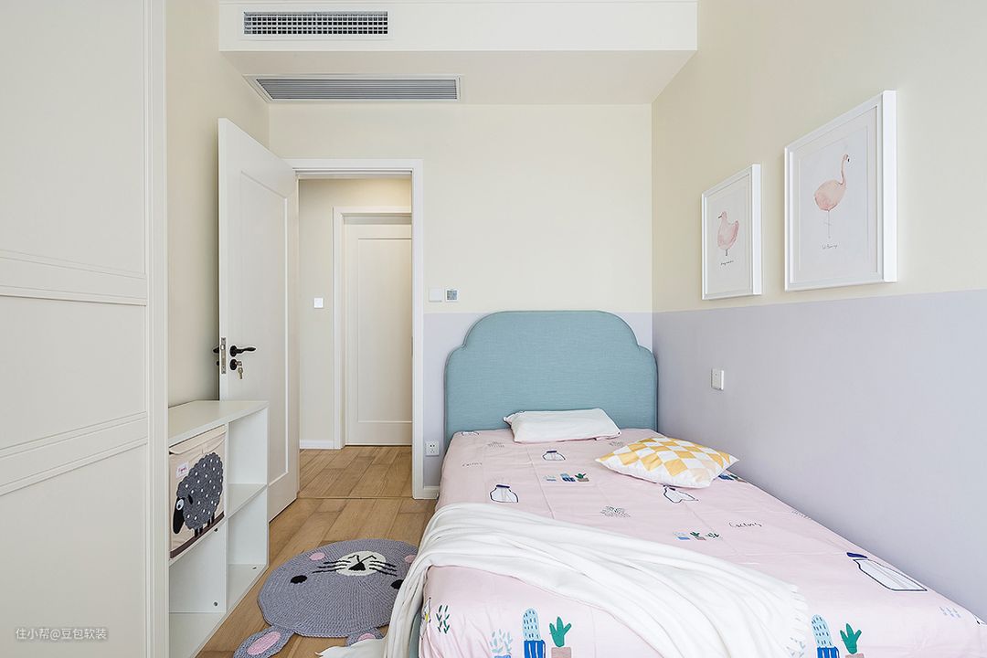 儿童房整体用香槟色为主,床旁的一般浅紫色,给孩子带来一点卧室的童趣 另一侧一字型衣柜放置孩子四季衣物,3*3的矮脚柜放置孩子玩具用品,让卧室时刻保持的干净整洁