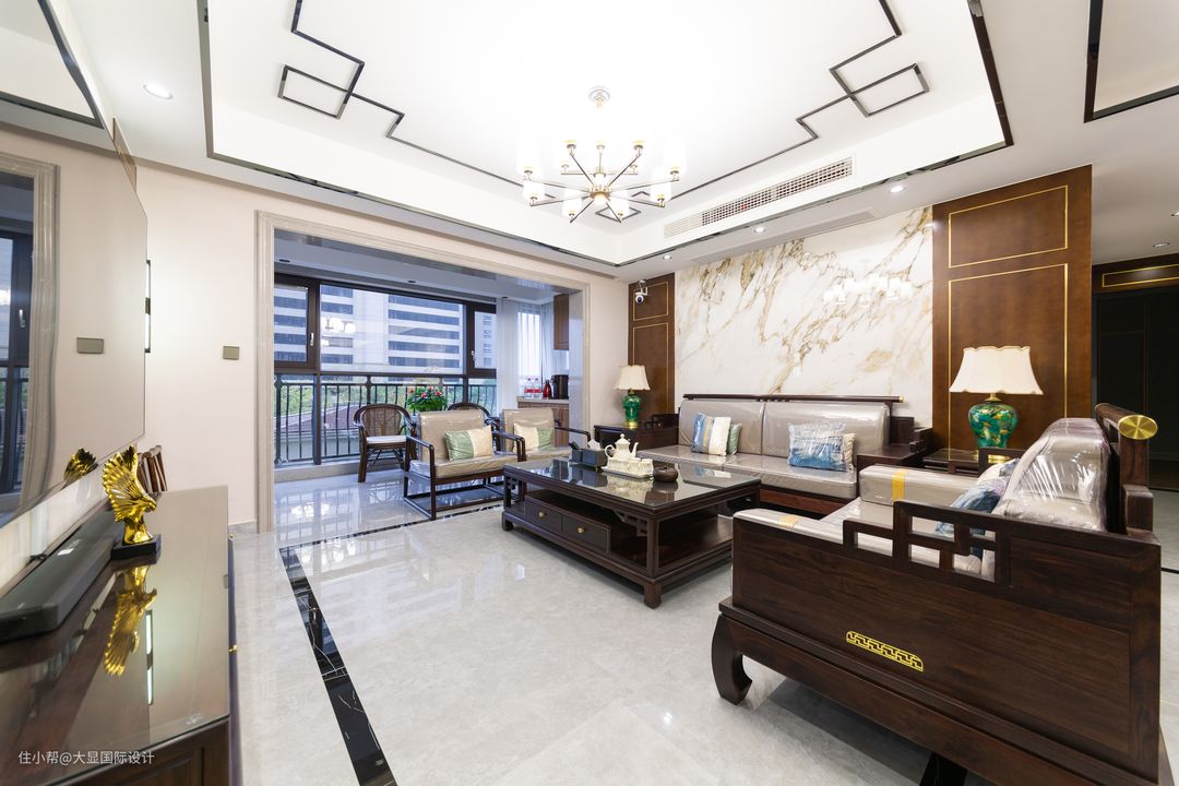 客厅,地面通铺清灰色瓷砖,墙面顶面中式线条方正,将吉祥如意的回形纹,自然融入设计中,从而避免了设计元素的简单堆砌。 空间布局对称平和,色彩搭配一深一浅,暗合道家「太极阴阳」之法,相得益彰浑然一体。选择了木质、皮质、金属等材质,让整个空间充满中国古典之美。 深木色新中式家具围合摆放,简约与精致做工结合,体现的大气与讲究。沙发背景墙,一面天然大理石材铺贴出山水意境的水墨画的视觉感。 金色自古是流淌在东方审美之上的艺术格调,其曲折流动氤氲在墙面上,抟虚成实,让这缥缈的东方意境,化为真实的带着生命智慧的生活空间。 电视背景墙留白,以对称为设计要素,一对壁灯点亮古色古香的一角,金属线条勾勒的木饰面中轴对称,与对面的沙发背景呼应。 中式风格的客厅内,搭配对称的一对金座绿瓶台灯,提升家居艺术感和中式韵味。