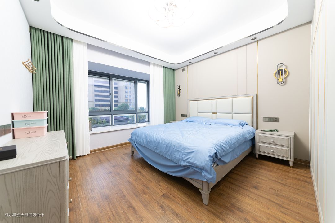 主卧室我们也进行了调整,床头和卫生间夹角空间,原来放办公桌区,改为一个步入式衣帽间,不仅避免床头正对卫生间门的尴尬。 且这是一条合理又舒服的动线,从主卫洗澡,衣帽间换完睡衣,进入卧室休息;或者早上睡醒衣帽间穿衣,再去卫生间洗漱,不浪费走路时间。