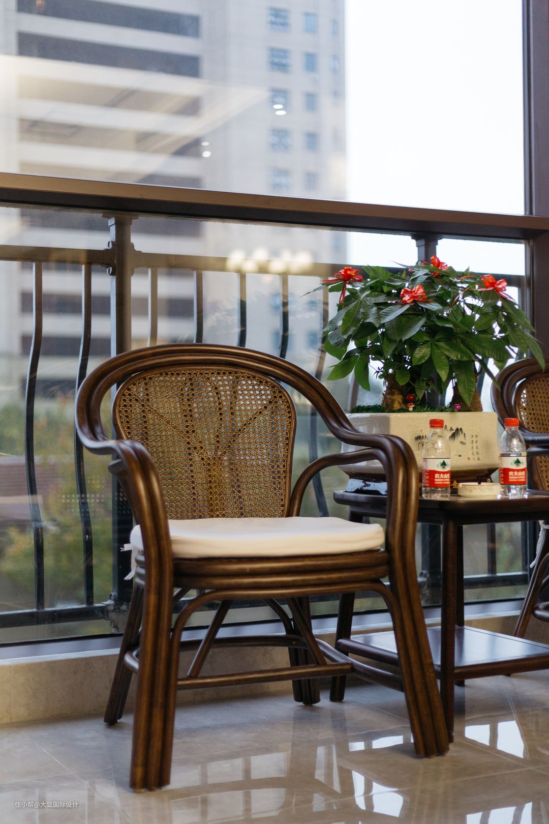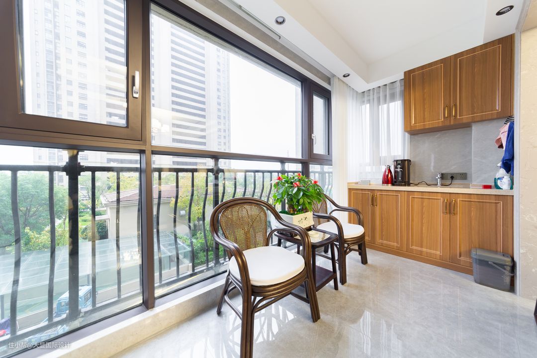 阳台加装护栏,避免老人的安全隐患,由于洗衣晾晒功能转移,避免客厅阳台挂太多衣物,阻碍自然光进入室内,采光更充足。 客厅阳台也可以摆上茶几藤椅,完完全全变成一个供家里人喝茶、聊天、观景的惬意休闲区。