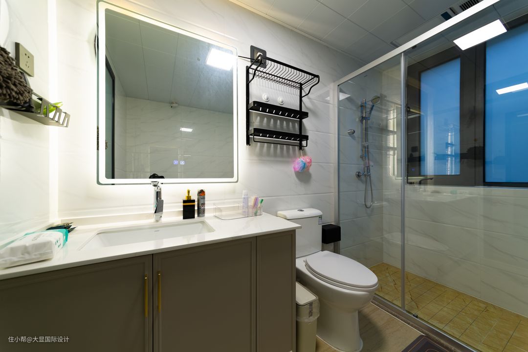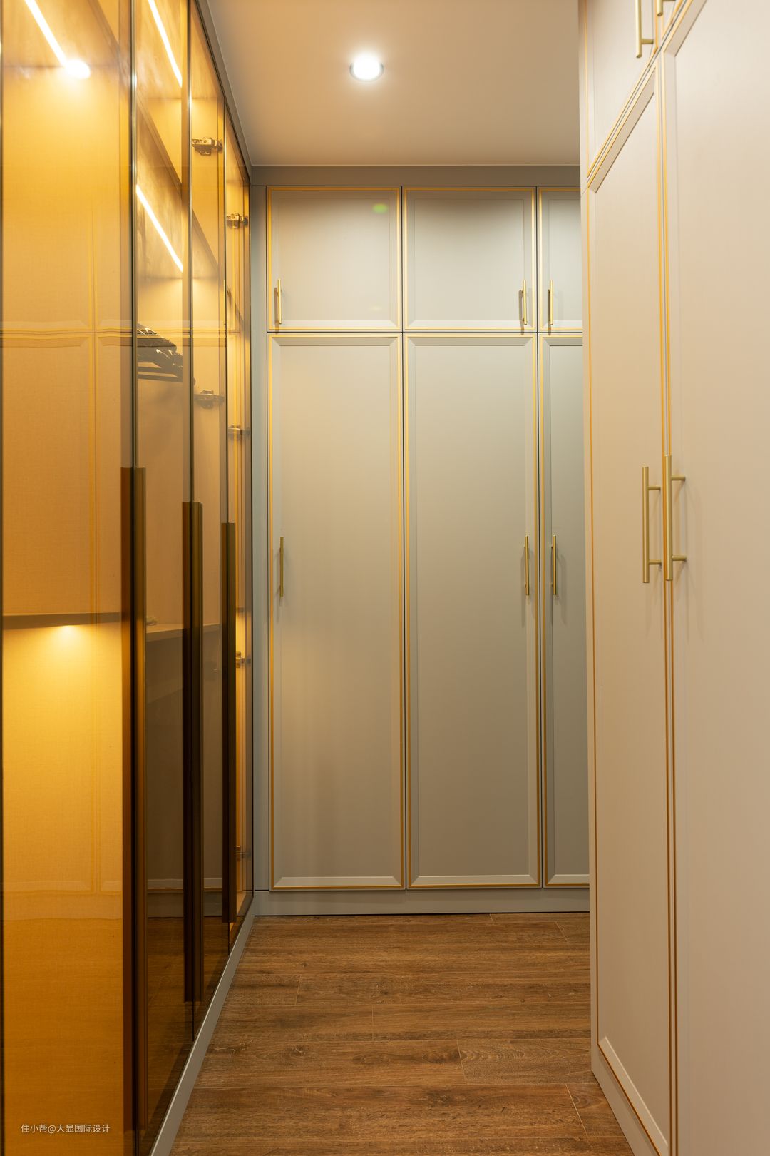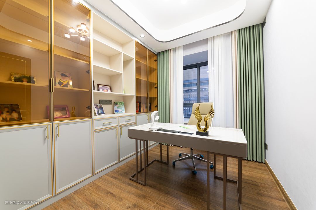 因为他工作需要居家办公,原来办公桌放置主卧里,会打扰到爱人休息,所以沟通时要求一定要给黄先生一个独立的书房。 所以设计师就把一个沦为杂物间的卧室改成书房,一整排的书柜用金边框+白柜体+茶色玻璃门设计,高级优雅。 除了摆放书籍,还放了一家三口的合照、儿子的大学毕业照,以及一些家庭照等等,可以看出来真是很幸福的一家三口。