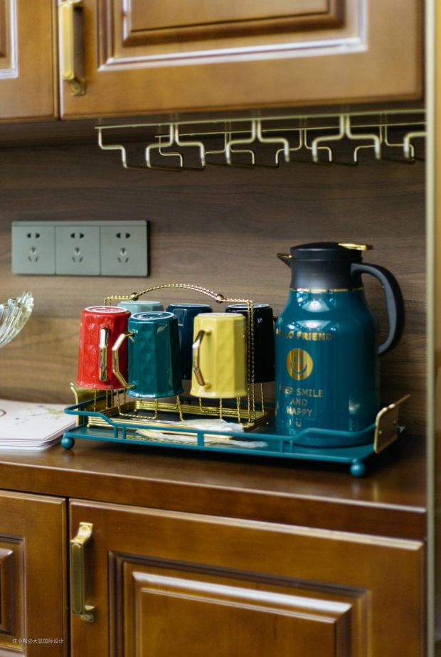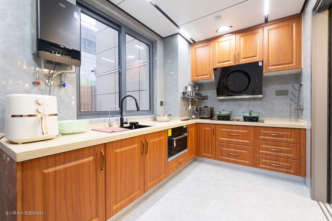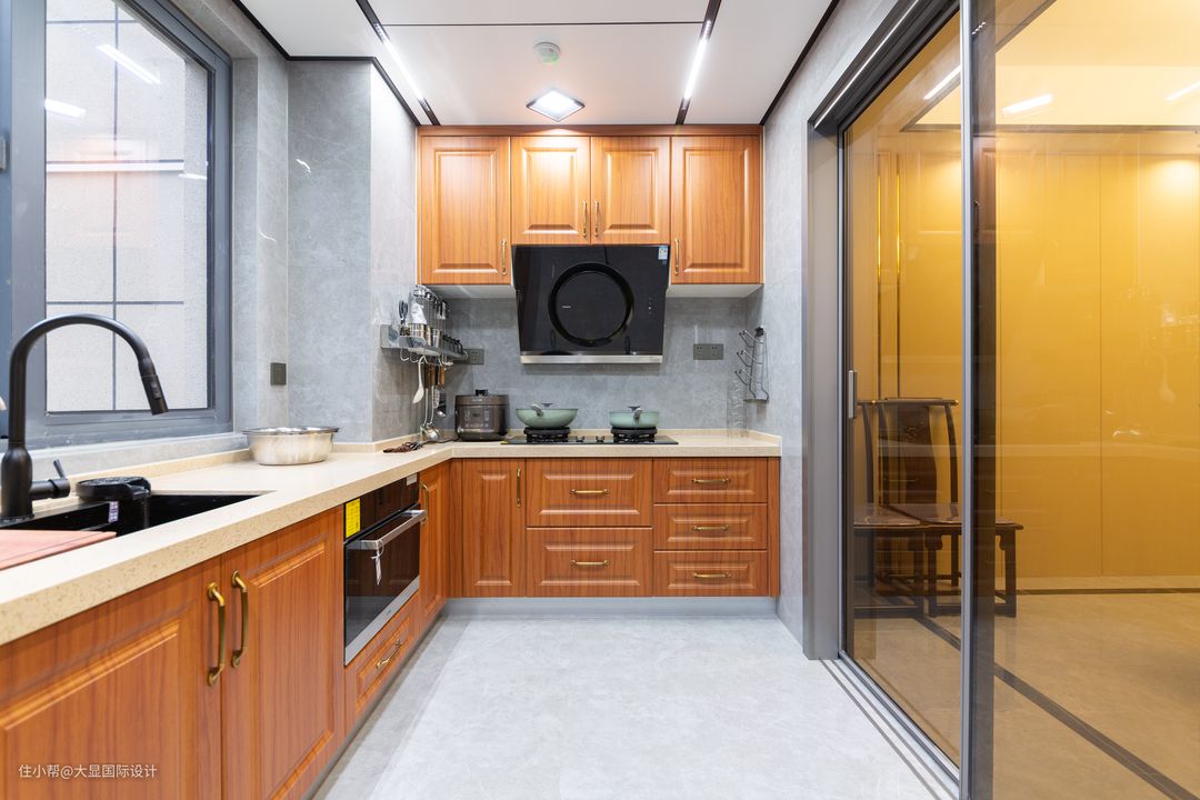 厨房呈L字型,电器嵌入柜体,动线合理,穿越千年的时间洪流,层层铺开活色生香的生命力,方寸间勾勒出人间烟火。
