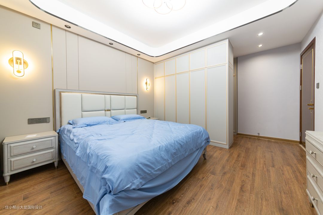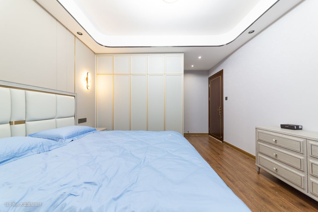 主卧是套房设计,不同于公共区的庄重典雅的配色,主卧浅色系营造宁静自然的舒睡空间,皮质护墙板与金属线条,打造的温婉典雅气质。 床尾增设成品斗柜,更方便黄先生夫妇随手收纳杂物的习惯,空间的独特,是设计师天马行空的想法,更是施工者工艺的完美契合。