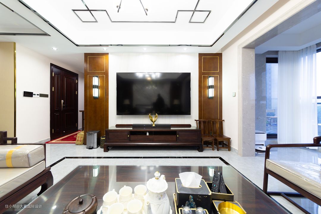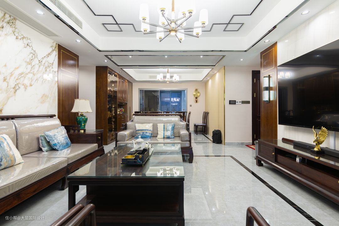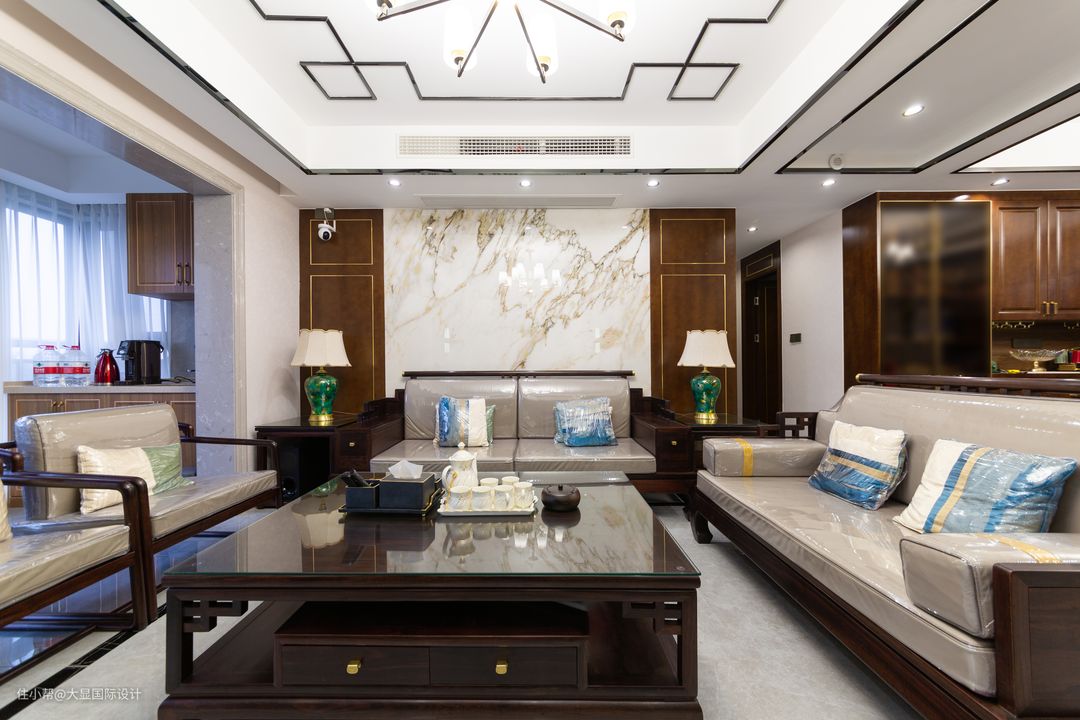 客厅,地面通铺清灰色瓷砖,墙面顶面中式线条方正,将吉祥如意的回形纹,自然融入设计中,从而避免了设计元素的简单堆砌。 空间布局对称平和,色彩搭配一深一浅,暗合道家「太极阴阳」之法,相得益彰浑然一体。选择了木质、皮质、金属等材质,让整个空间充满中国古典之美。 深木色新中式家具围合摆放,简约与精致做工结合,体现的大气与讲究。沙发背景墙,一面天然大理石材铺贴出山水意境的水墨画的视觉感。 金色自古是流淌在东方审美之上的艺术格调,其曲折流动氤氲在墙面上,抟虚成实,让这缥缈的东方意境,化为真实的带着生命智慧的生活空间。 电视背景墙留白,以对称为设计要素,一对壁灯点亮古色古香的一角,金属线条勾勒的木饰面中轴对称,与对面的沙发背景呼应。 中式风格的客厅内,搭配对称的一对金座绿瓶台灯,提升家居艺术感和中式韵味。