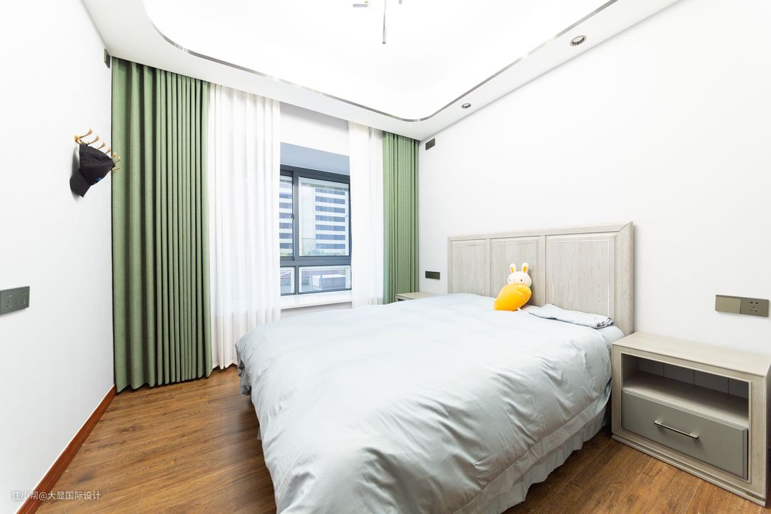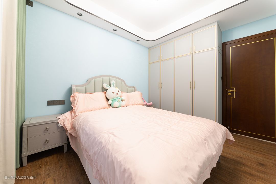 儿子房同样简约大方舒适,通顶大衣柜,特意定制的转角开放层板,既弱化边角界限,也给展示收纳提供更多的可能。