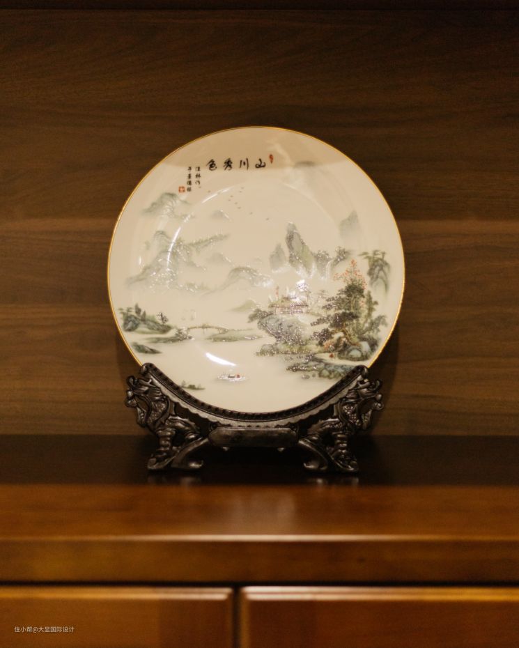 归家,要有仪式感。 正对入户门的空间,我们用一张条案辅以绿植摆件,打造入户端景,表达家居视觉的中式韵味,铺设“倒福”图案地毯,表达“福到临门”的美好意愿,同时起到限定空间的作用。 玄关另一侧保留了原有入户收纳设计,但改为一排实木储物柜,大气稳重。 中部开放格中式山水摆件,呼应端景,可随手搁置钥匙、手机、水杯等小物件,底部腾空20公分,用以一家三口日常换鞋便捷。
