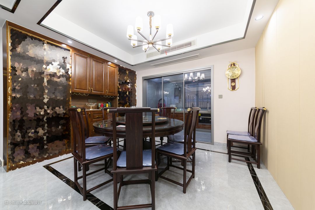 餐厅延续客厅的中式格调,整个公共领域南北通透。 餐厅讲究实用与美观结合,软硬装刚柔搭配,笔直方正的线条走势刚劲有力,圆桌团圆之意,舒缓视觉,整个空间舒适和谐。 餐厅木质运用的恰到好处,门框、收纳柜、吊顶线的选择保持色调统一。餐桌椅选用厚重质感的深色系,和整个空间完美搭配,经久耐用;顶部吊灯造型唯美简约,给空间优雅视觉效果。 空间设计讲究在日常生活中显示品位与品质,餐厅背后整面餐边柜,中部开放台面,也为泡茶待客提供便捷。 设计了展示区,方便业主藏酒展示,在节日聚餐中方便拿取,为空间提升档次。