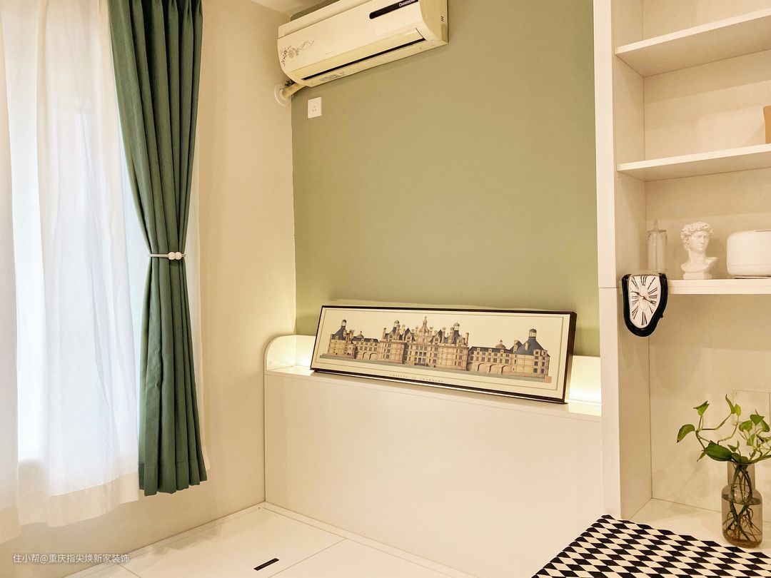 次卧的感觉更加清朗,绿衣色系的搭配足不出户就能感受万物皆春。 ①定制的衣柜+储物架,书桌和床一体的设计将面积利用的刚刚好,衣柜1.7*0.6米做到顶,置物架1.5*0.4米做到顶,书桌代替床头柜,在10平方米的房间设计榻榻米的设计能满足更多使用的可能性。 ②杏子灰+伦敦雾色乳胶漆,清新平静!石膏板平顶+无主灯净化空间,让空间无负担。