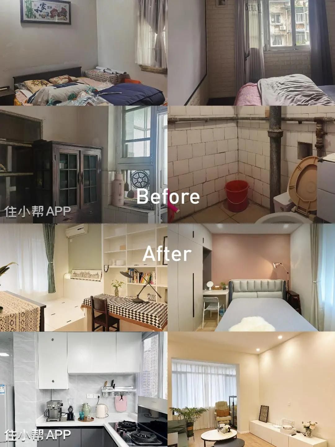 该项目在一幢老式居民楼里,从室内到室外时间仿佛静止在90年代,61平方米的两室一厅的装修如图所示的老旧过时。 ①客厅昏暗拥挤,地面是300*300的小砖,外阳台有合页门+半墙窗户。 ②厨房是上世纪砖砌的老款式,没有像样的橱柜,暴露的水管,历史痕迹很“浓厚”。 ③卧室:主卧墙面白漆有水渍痕迹,次卧则是斧凿式的墙砖,但收纳都不多,居住条件略简陋。 ④卫生间:没有包落水管,墙砖发黄……
