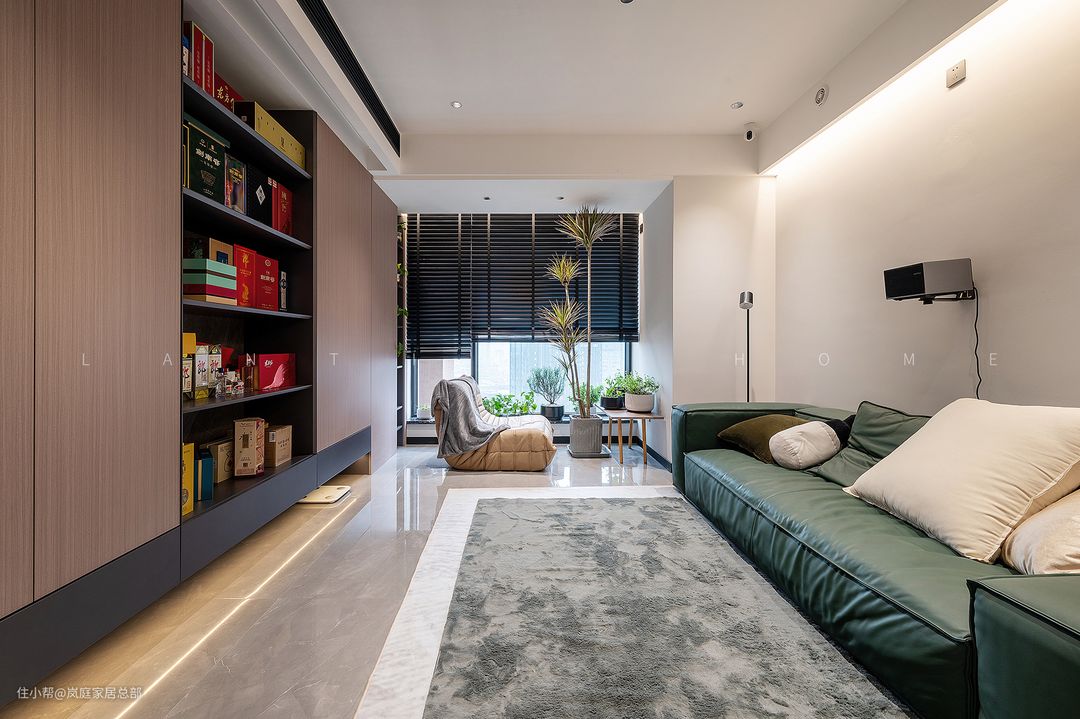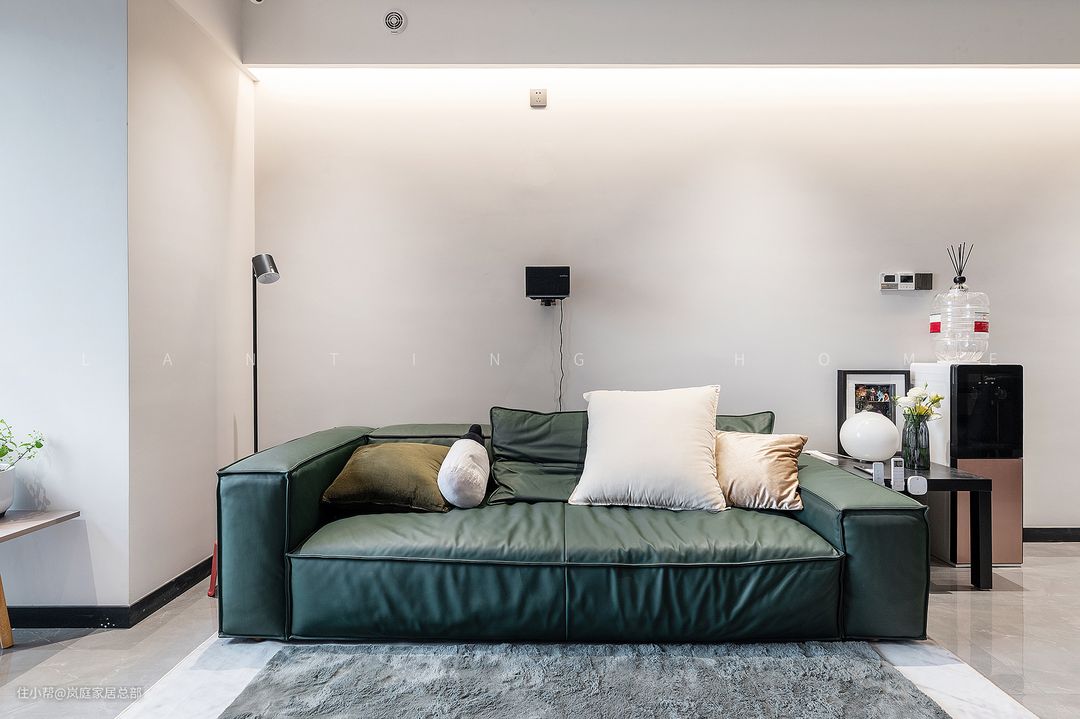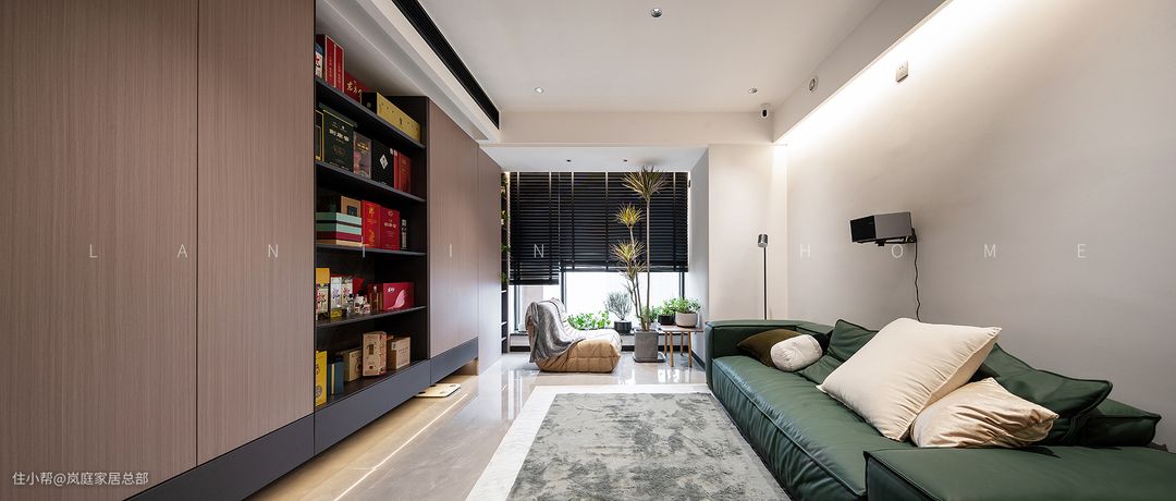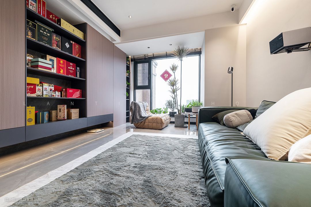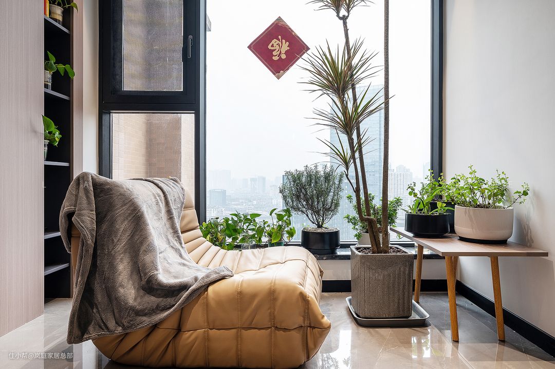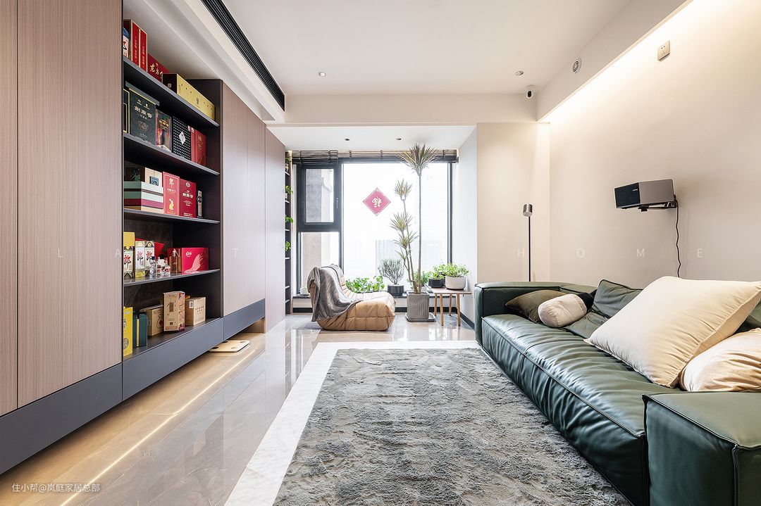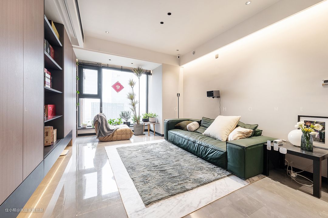 客厅做了很多和潮流接轨的设计,没有做传统的电视墙和电视柜设计,选择整面墙做收纳提高收纳能力的同时保证空间的实用性。整个家没有多余的色彩,利用汝窑乳胶漆通刷让室内空间更有高级质感,客厅选择低饱和度的配色,在软装搭配方面则选是深沉的颜色,利用配色提升空间魅力。 利用无主灯设计,将筒灯散落四周的形式,增加落地灯和灯带提升空间的惬意感,在吊顶下方增加灯带,能让居家生活更有氛围感。考虑到空间动线的流畅性,选择直排型沙发款式既能满足夫妻俩的休闲需求也能不占用动线空间,将阳台和客厅之间连通,利用毛毛虫沙发提升空间的慵懒感。为了让室内空间的光线足够敞亮,利用落地窗封窗能直接在惬意的周末沐浴阳光。屋主是喜欢生机盎然的样子,在阳台种植盆栽能为空间加分。 地砖选择柔光砖通铺,800*800的地砖通铺提升整体视觉感,这也是很多家庭常用的地砖尺寸。夫妻俩喜欢坐在地上玩手机,在客厅的沙发区域利用灰色地毯铺贴,能减少地砖带来的冷硬感。