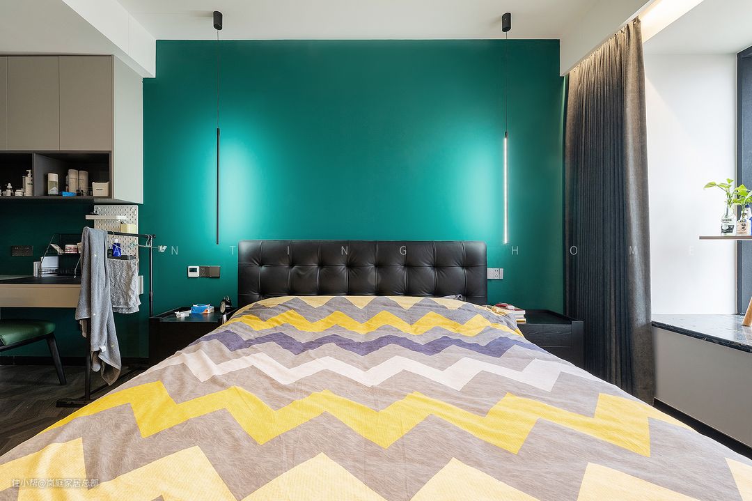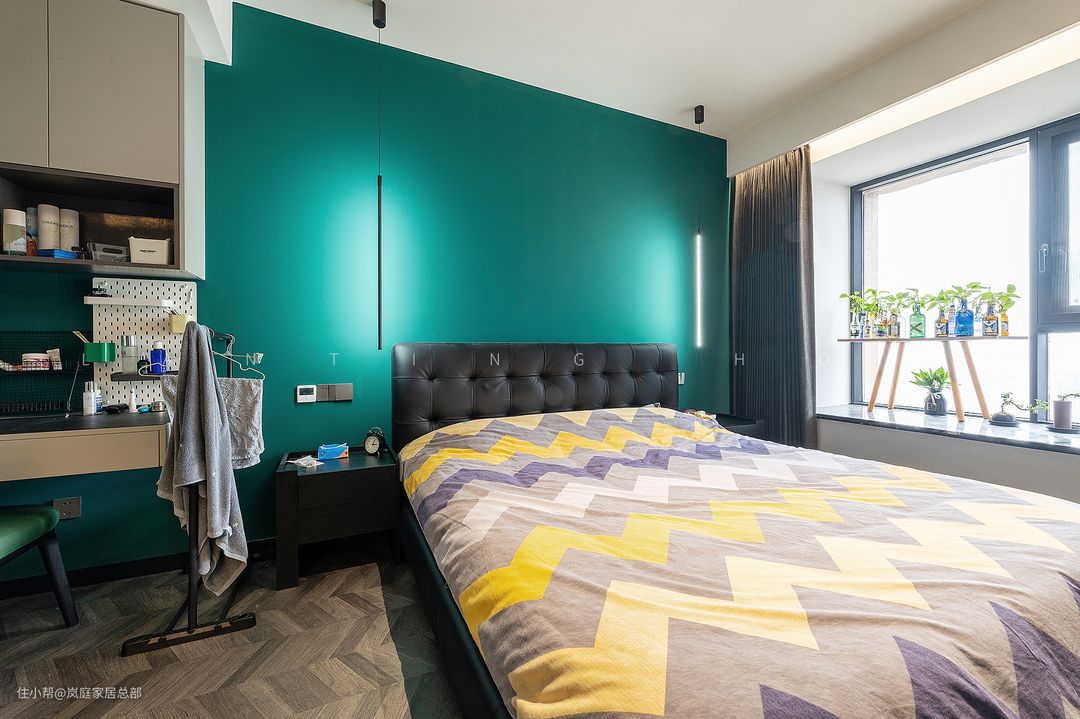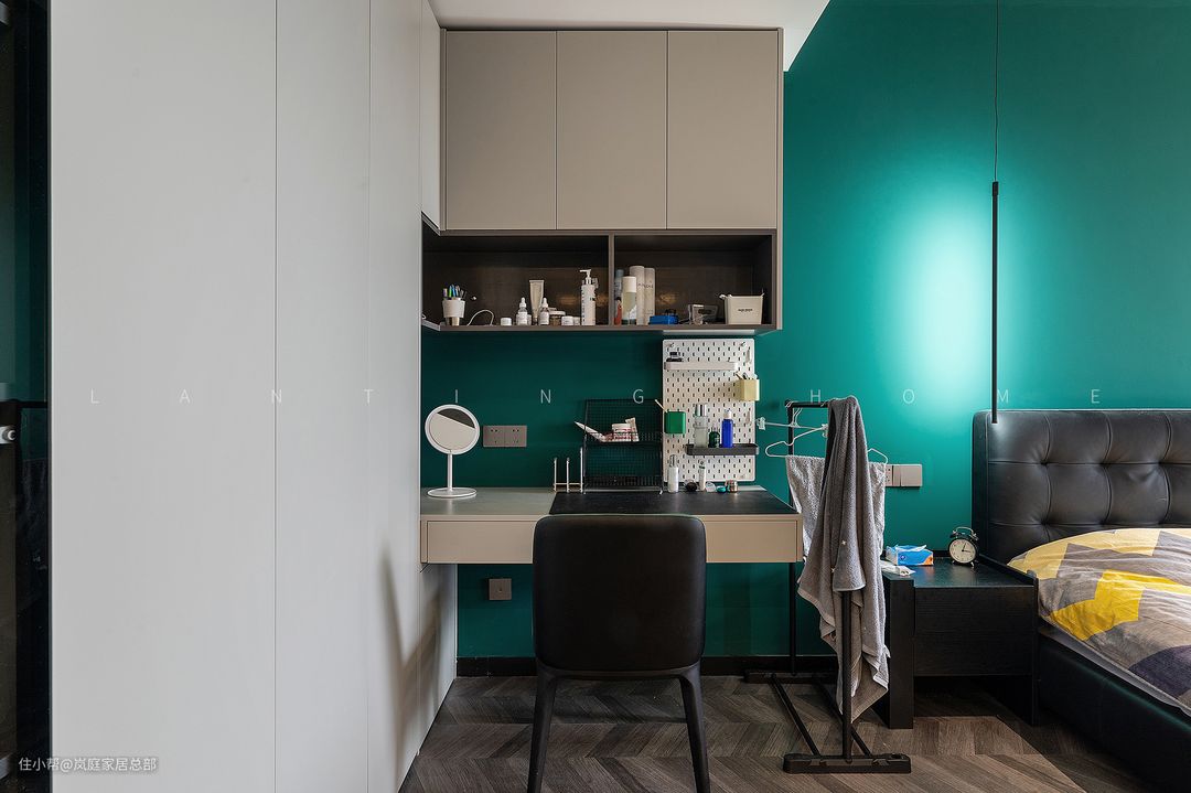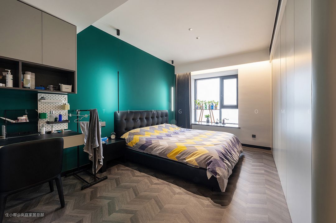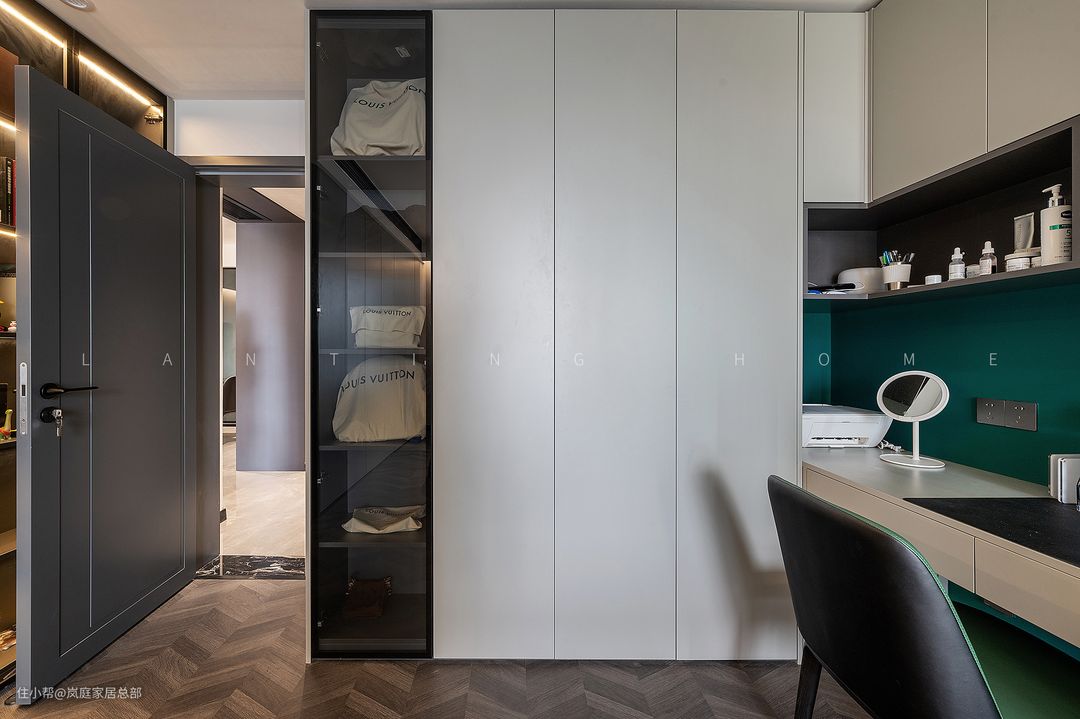 主卧的面积是比较宽敞的,在卧室背景墙利用哑光绿装饰,提亮空间配色的同时也不会显得沉闷。将卧室做三分区设计,合理分布休息区、办公区和收纳区,提升收纳能力的同时也不会影响动线布局。在床尾做了整面墙的定制衣柜,选择一门到顶的设计,视觉效果更显高级,柜门选择按压式设计,不用考虑拉手的搭配。 在床侧也做了定制衣柜的设计,为了保证办公需求,利用衣柜延伸办公书桌的设计,提升空间利用率的同时也能满足屋主的多重居住需求。卧室选择木地板铺贴,完全不同于公共区域的设计,人字拼木地板能提升空间的设计质感。 为了不让柜门显得单调,增加了一组玻璃柜门和灯带的组合,提升空间的俏皮感。