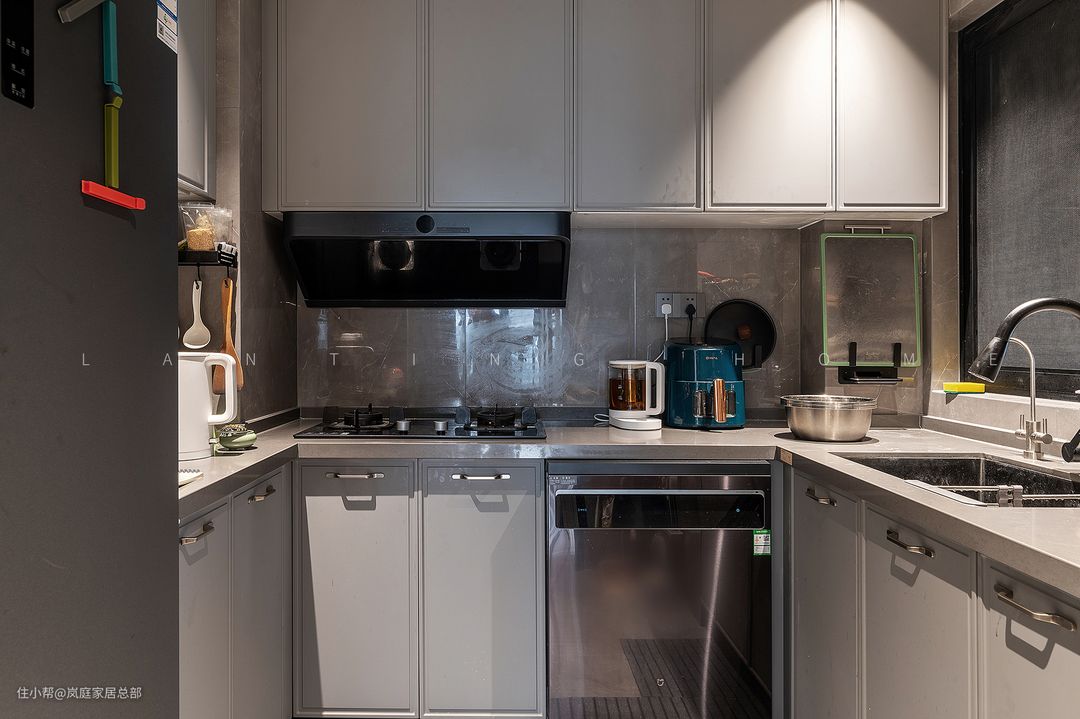 厨房空间不大,但是能满足U型橱柜的布局,极大地提升空间的操作流畅度,也能让收纳事半功倍。厨房的配色以深灰色为主,凸显空间的高级质感。吊柜和橱柜的配色选择一致,将操作区和水槽区分开,不会影响做饭的效率,即使多几个人同时在厨房也不会显得拥挤。 为了提高生活品质,将洗碗机嵌入橱柜,不用担心洗碗难题,将双开门冰箱嵌入橱柜,充分发挥嵌入式设计的优势。在确定厨房布局和橱柜设计时,需要提前确认冰箱的尺寸,避免后期造成放不进的问题。