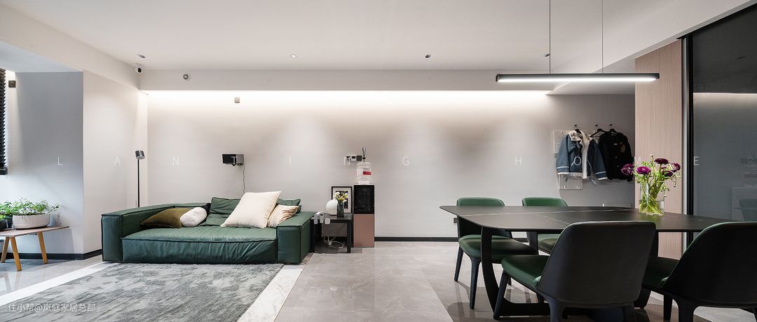 在配色上选择低饱和度的汝窑,耐看大方的同时也不会显得艳丽,这样搭配在软装方面能有更多发挥空间。整个房子采用无主灯设计,利用灯光效果让家有层次感,没有传统吊灯的笨重感,能在视觉上提升空间的高级感。