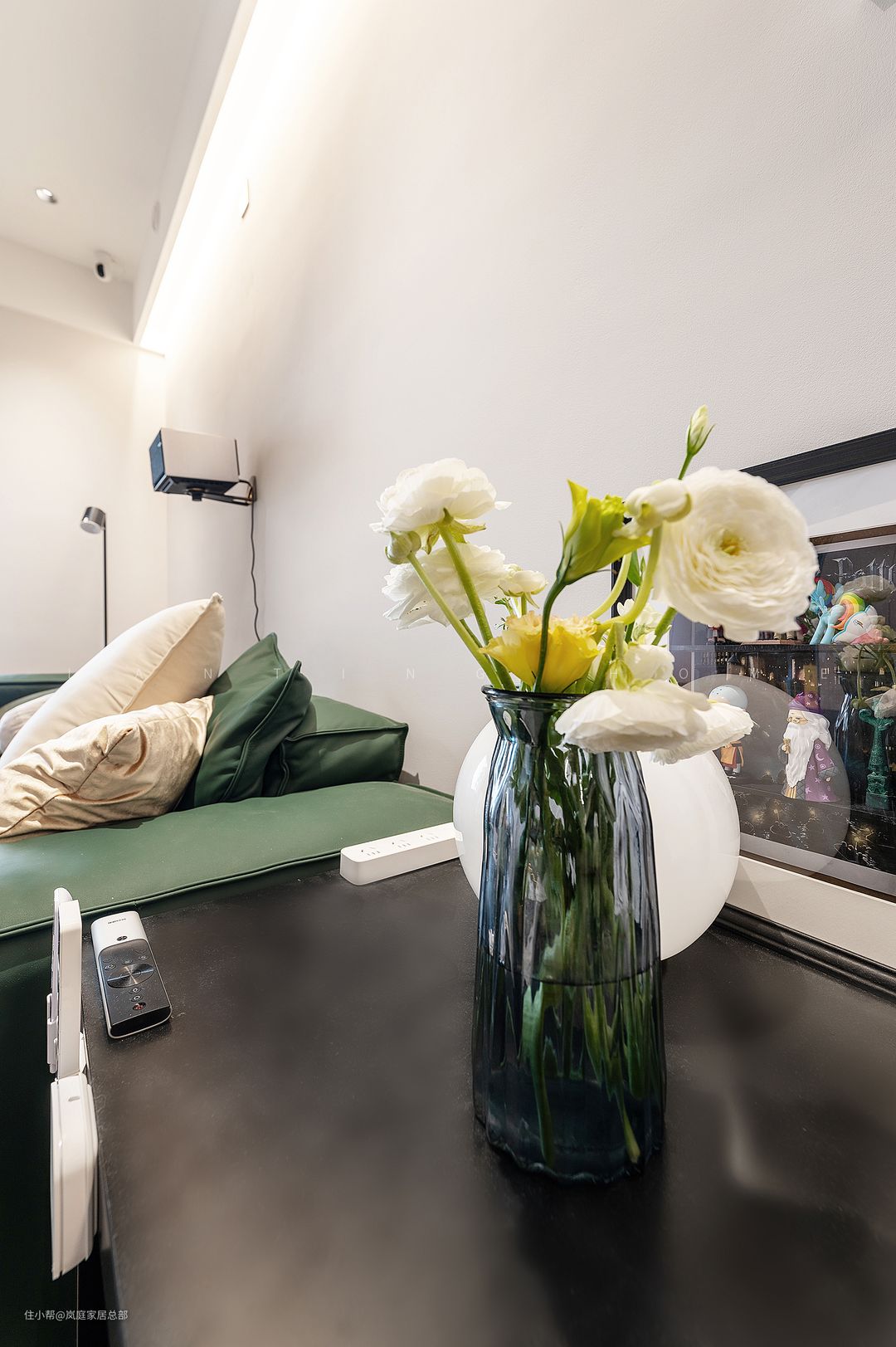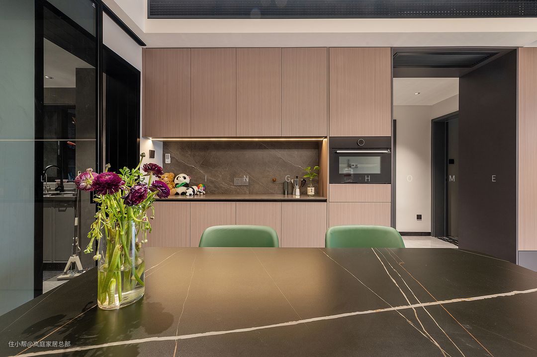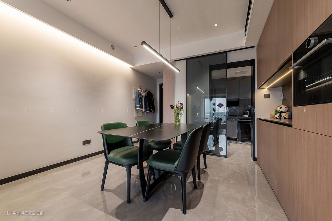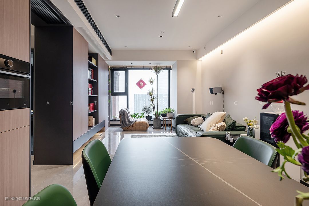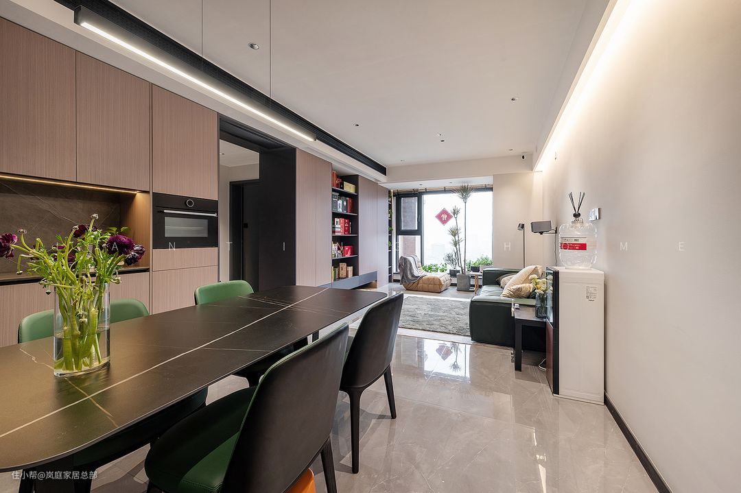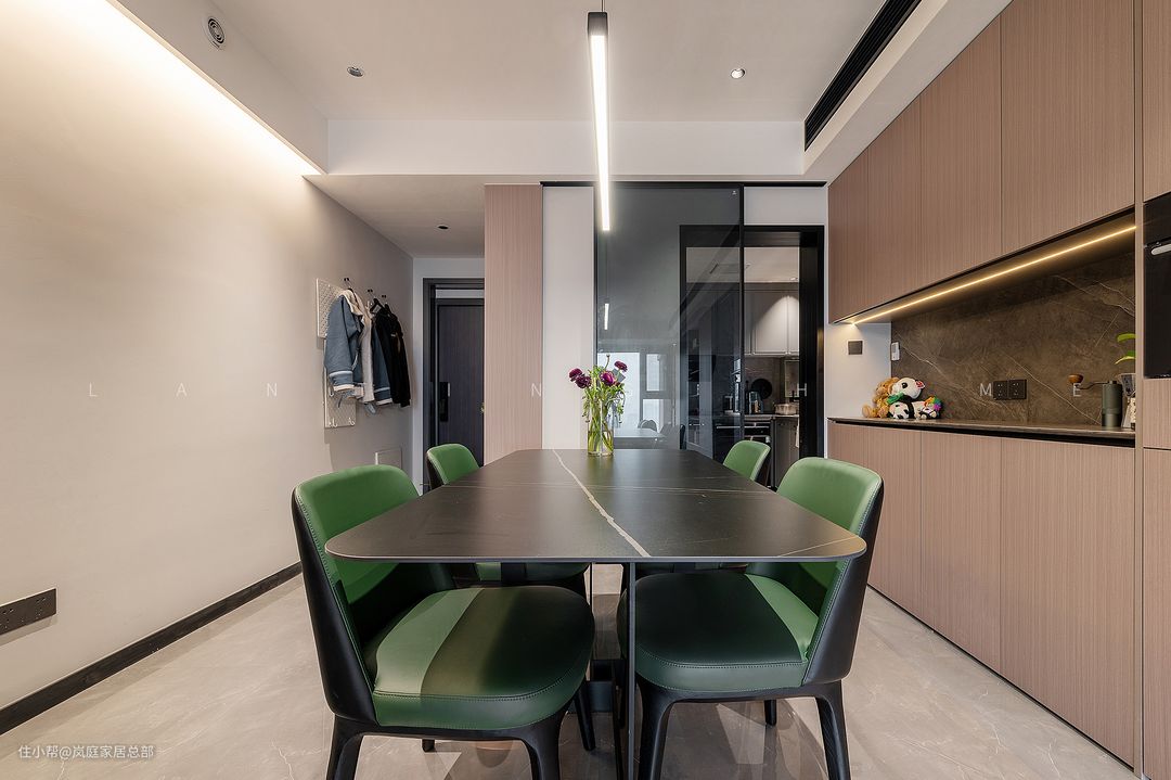 开门见厅的户型是多数,只能通过动线布局来进行优化。餐厅的面积是不大的,一款黑色岩板餐桌搭配墨绿色皮质餐椅作为点缀,提亮空间色调也能和客厅沙发的颜色保持一致。餐厅是需要氛围感的,利用一盏吊灯放在餐厅中间,将光源直接打在餐桌中央,能提高食欲的同时氛围感也能得到保证。 餐椅选择微拱造型,符合人体工学,整体的舒适感会更好。在餐桌上放置鲜花,让居家生活有仪式感,整体的舒适感会更好。