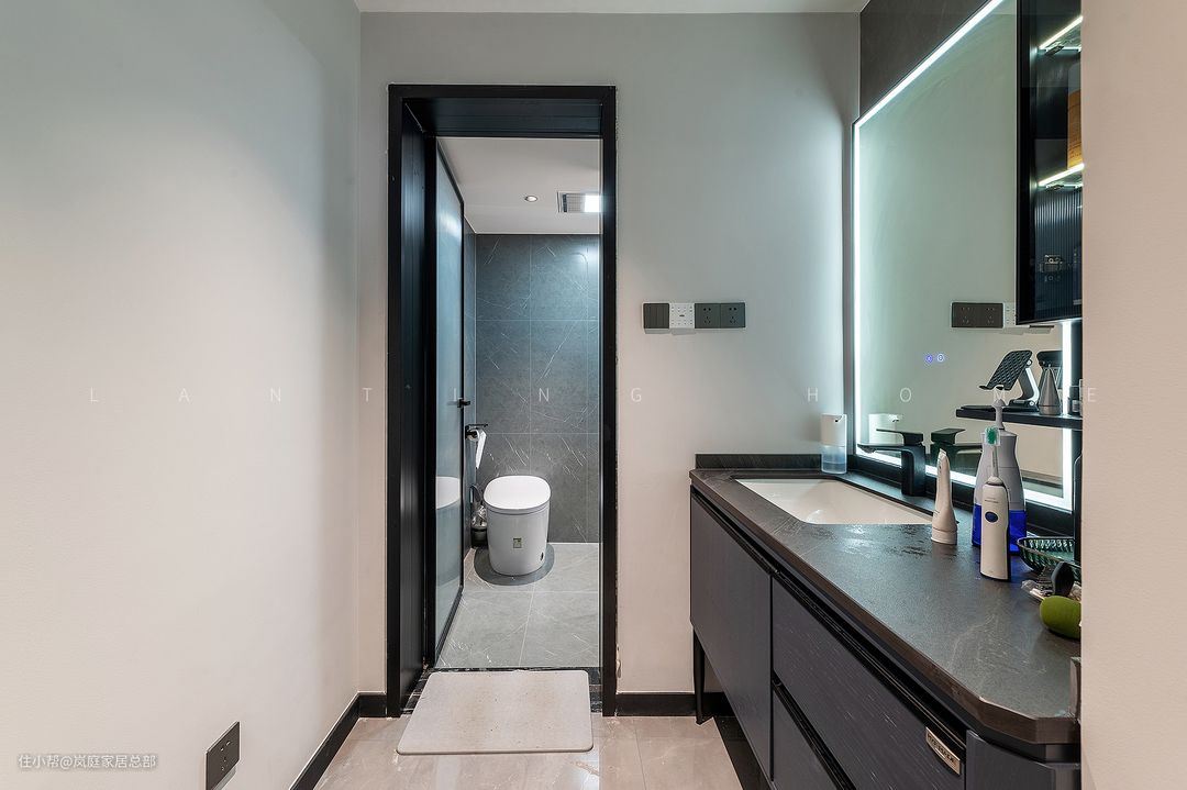 卫生间选择三分离设计,能让夫妻俩的居家生活更便利,将洗手台外移提升空间的流畅性,由于是单卫,难免会存在拥挤的情况,洗手台外移不会影响早高峰的使用。选择细高腿的成品浴室柜,不用做悬空设计,方便后期更换。智能化妆镜的存在有一键除雾功能和灯带设计,能增强空间的高级感和体验感。