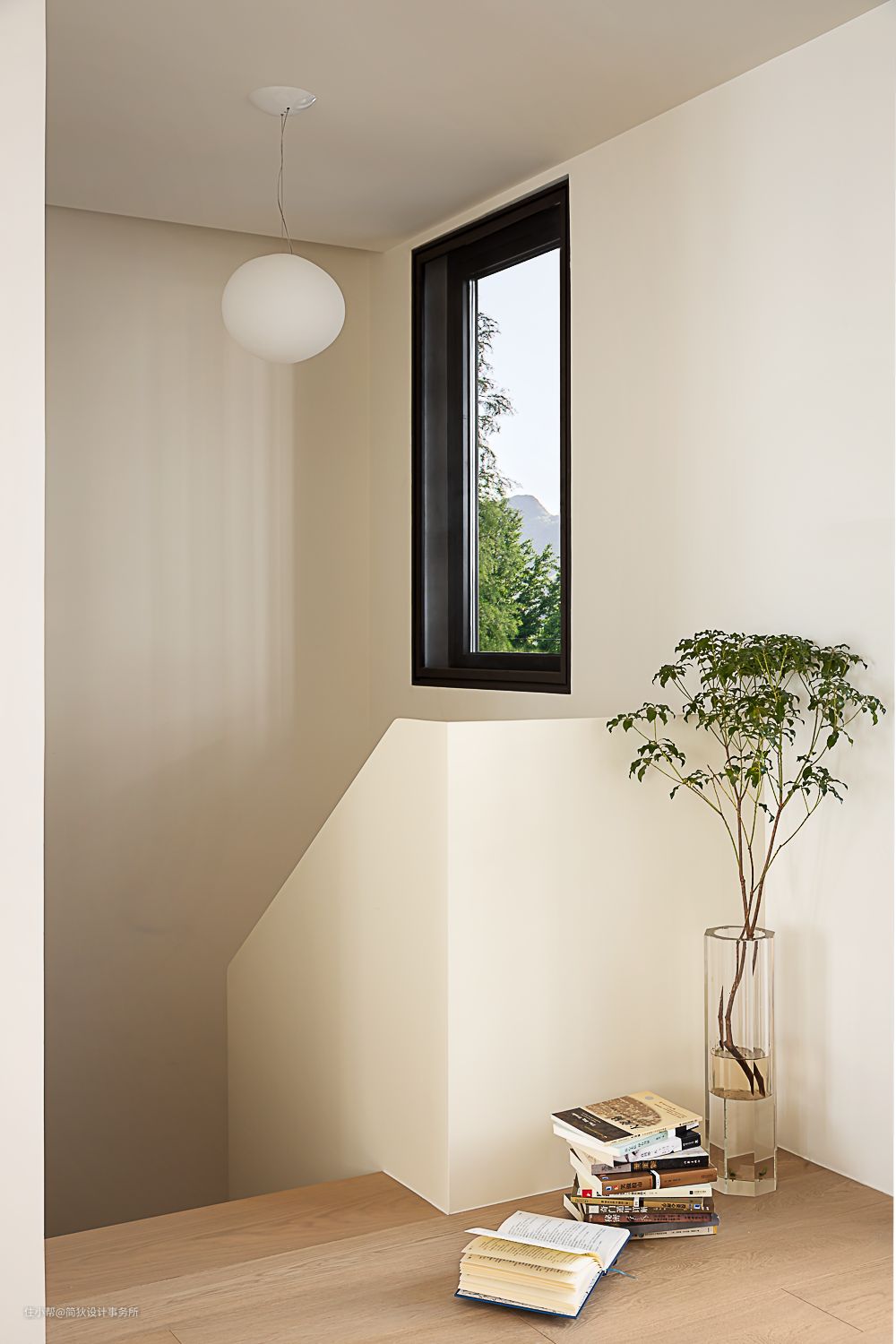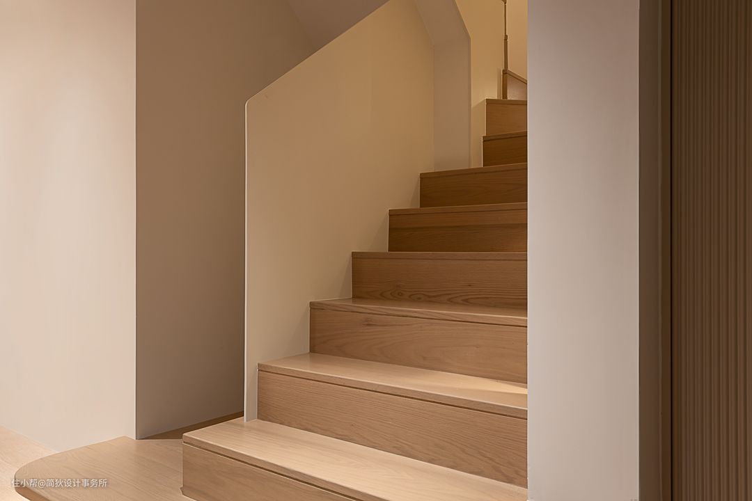 我们调整了原楼梯踏步数,在起始第一台阶处增加了一个大地台,钢板扶手和墙顶面涂刷同色系涂料。 楼梯踏板选用纯实木,经过特殊调色处理后和木地板保持同色,让地面有一种延伸而上的通铺感觉。