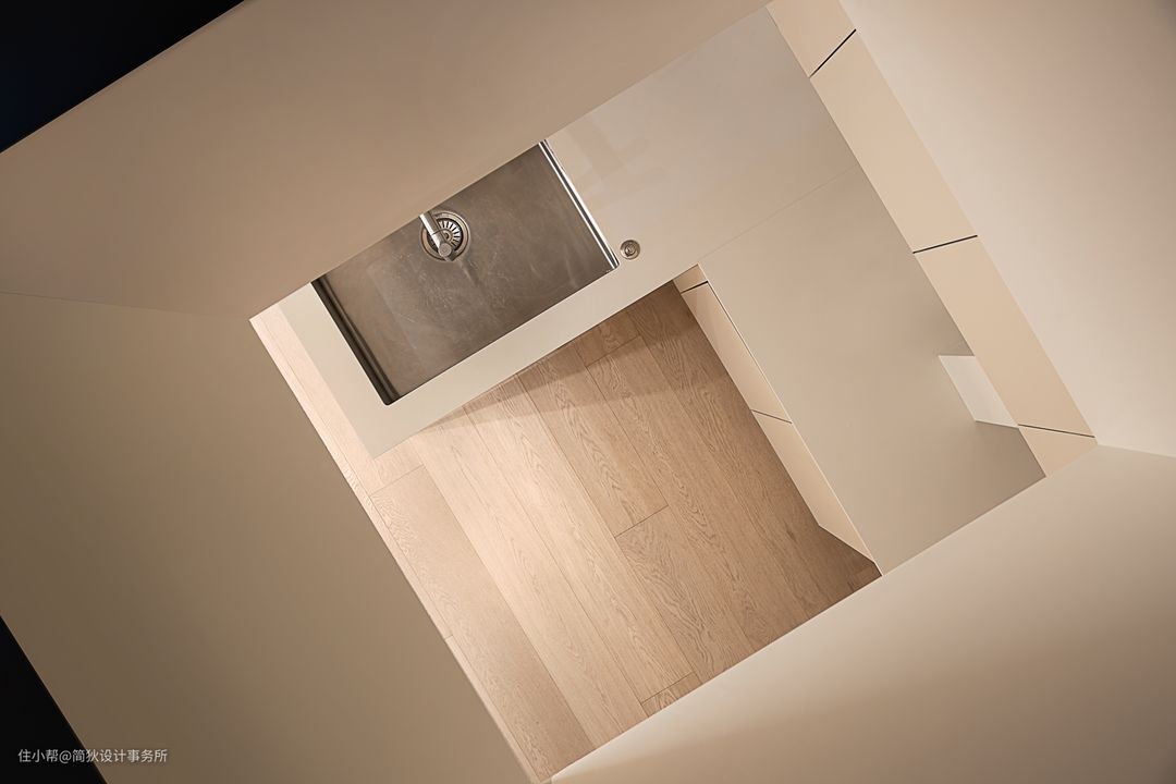 正对楼梯的区域规划为开放式厨房,浅灰色的橱柜和雅白色的岩板台面搭配,下柜内嵌一款通体白色的洗碗机,来自德国美诺Miele品牌,厨房整体呈现出温暖而雅致的色调。内天井改造为室内空间后,部分面积释放给了厨房,所以在封顶的时候我们特意预留了一扇天窗给到厨房日常照明。顶面的自然光直接投射下来后可满足整个厨房的照明需要,不仅弥补了立面没有窗户的缺憾,同时一种举头可见蓝天与星辰的全新体验也充满乐趣。柴犬“开心”会时不时地透过这扇露台上的天窗,饶有兴致地注视着女主人快乐而忙碌地穿梭在厨房,有时还会顽皮的留下几朵梅花印……