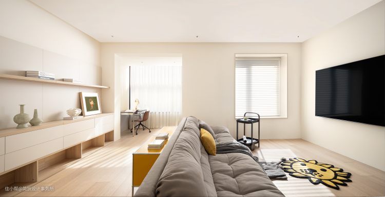 二层定义为屋主的独享空间。两间卧室合二为一成为一间朝南的大客厅,内阳台与室内连通,设计为开放式书房。 为了进一步提升采光,内包阳台采用落地大窗,尽量减少窗格,增加通透感。Baxter的云朵沙发置中摆放,动线围绕沙发自由流转不受约束,沙发背后是一组暖黄色的USM的收纳柜。靠墙定制整排低柜结合层板的形式,开放而有序。 周末的闲暇时光,一人一狗一本书,窝在舒适柔软的沙发里独享属于自己的有限空间,无限世界…… 101CPH的经典艺术雕塑,在日本极简主义和斯堪的纳维亚文化的滋养下,呈现出东西方美学的交融与共生。 坐在客厅里,可望见露台的风景,南北的通透更带来了居住的舒适体验。