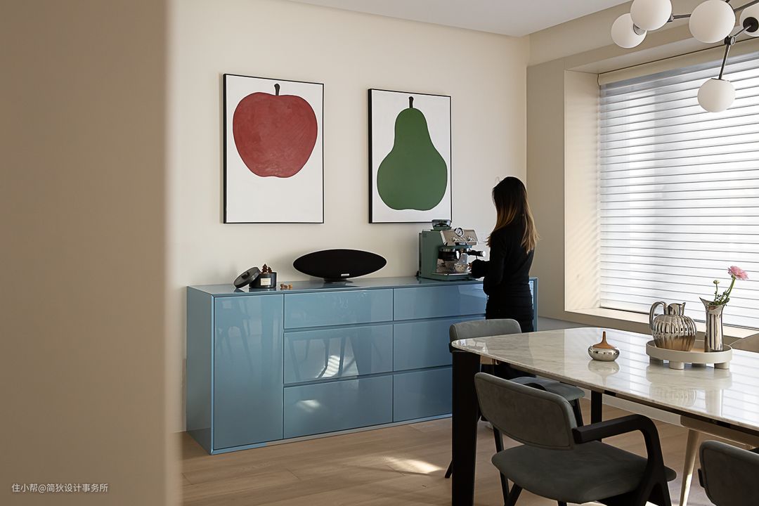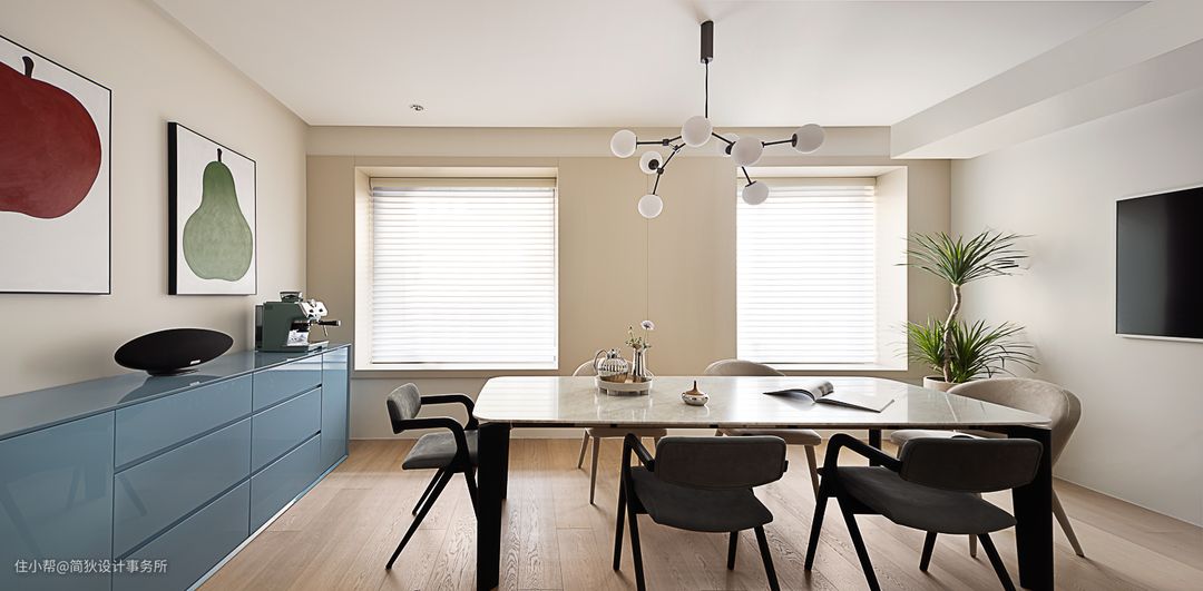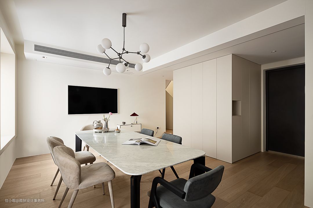 餐厅原本有两扇各自独立的大窗,我们将极简窗套和墙板整体拉平,形成一个凸出墙面2cm的悬浮效果,并内嵌反光灯带,极简的造型分隔出立面的层次感。 屋主非常钟爱制作咖啡,餐边柜上这套德龙的咖啡机是每日必不可少的陪伴。在冬日的午后,咖啡的香气弥散在温暖的阳光和慵懒的爵士乐里,是无比惬意的享受…… 全屋使用福乐阁4311乳胶漆,营造出温暖无边界感的家居氛围。定制的餐边柜则大胆选用了雾霭蓝,在和谐的关系里创造出色彩碰撞的乐趣。 一层原本是客厅区域,我们改造为餐厅后,空间感和舒适度都非常优越。标准的六人位餐桌来自意大利著名家具品牌B&B,分子吊灯则来自丹麦品牌101CPH,三星画壁超薄艺术电视给空间带来更多交互式体验。这里既可以是家人朋友聚会的餐厅,又可自由切换成沙龙或者会议的氛围。 全屋吊平顶,采用无主灯设计。公共空间和卧室采用地板满胶通铺的工艺,打造出无踢脚线的极简落地效果。
