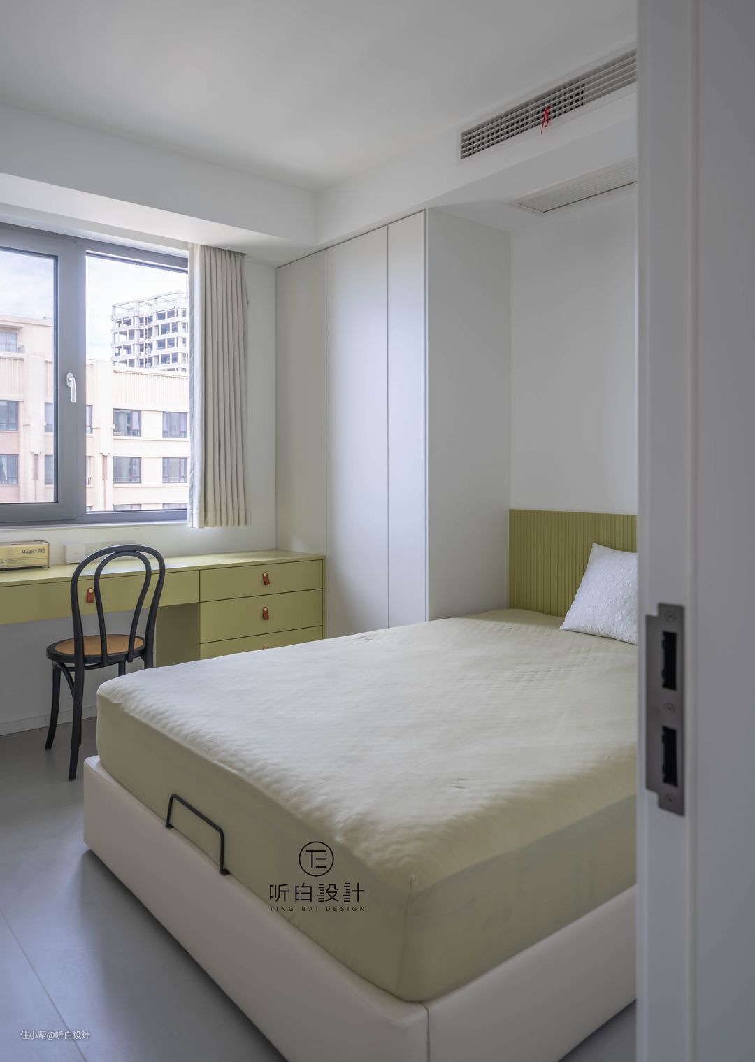 客房的设计则延续了春草绿的色彩,简单的衣柜和靠墙的书桌,让整个空间都明亮动人起来。