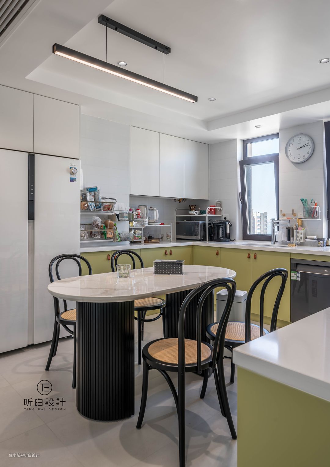 柜门选择春草绿,特别有春天的气息。 而我们拍摄的时候,小可爱已经开始正式入住啦,合理规划的架子和篮子,特别有烟火生活的味道。