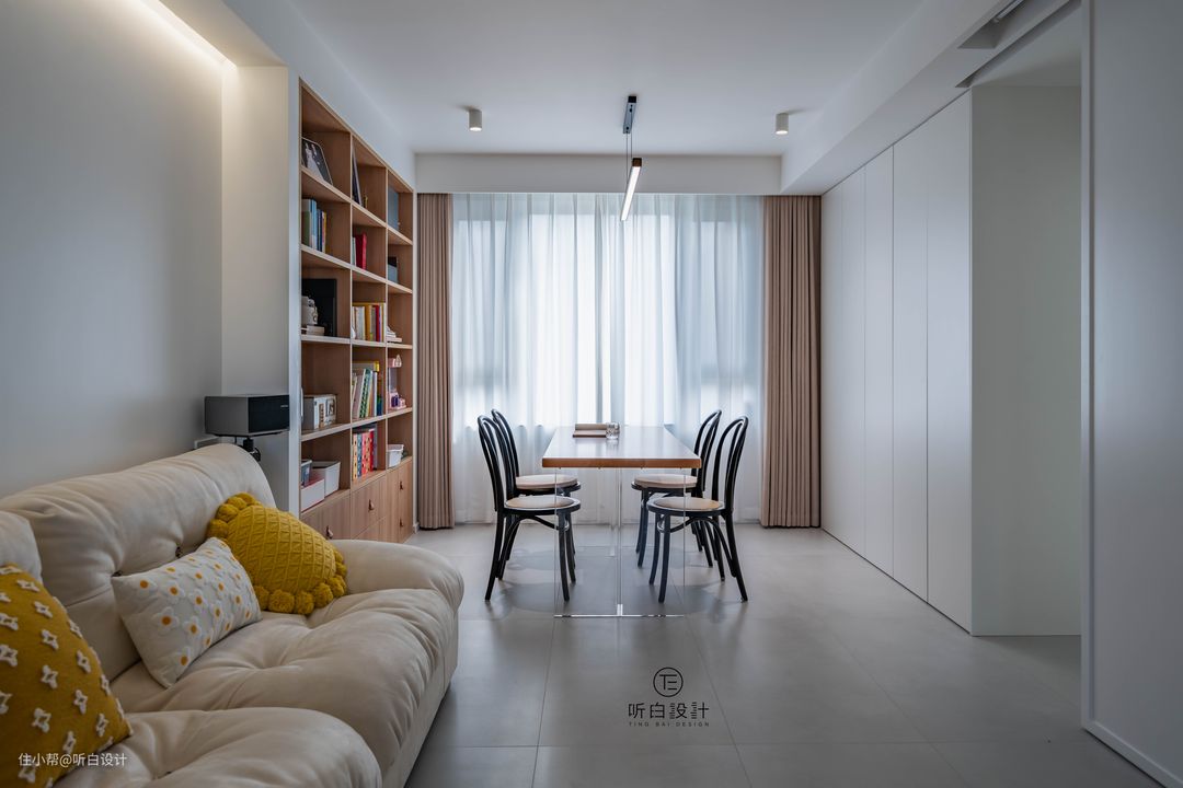 这里是客厅也是书房,休闲娱乐和办公学习一体,实现空间的复合使用。 满墙原木色嵌入式书架特别有文艺的气息,悬浮款长桌更让空间有通透感。 通顶的杂物柜全部采用反弹器安装,让一整排柜子像墙面一样,更显得大方雅致。