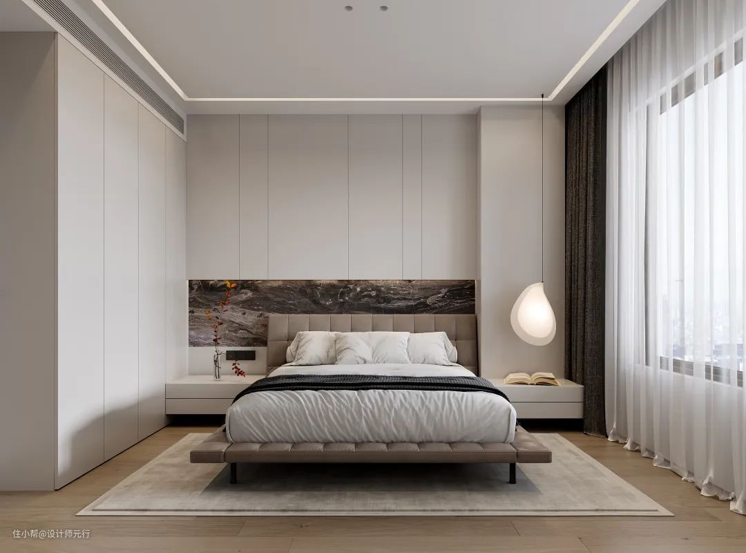 进入卧室,通过对材质粗糙和细腻的两种不同处理,让距离感和亲和力这种矛盾的差异同时存在。“光”是时间的使者,简洁的线条设计与不同光线的引入交汇融合,营造出有生活质感和磁性的生活空间。