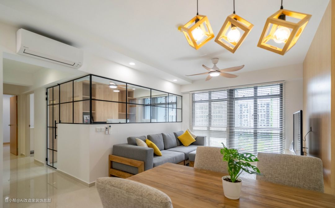 北欧风与原木色是一对老搭档了,沙发靠墙后是开放式书房区。 电视背景墙一半木质调一半镜面式,视觉上增大空间,百叶帘透过的观影让人不得不多看两眼。