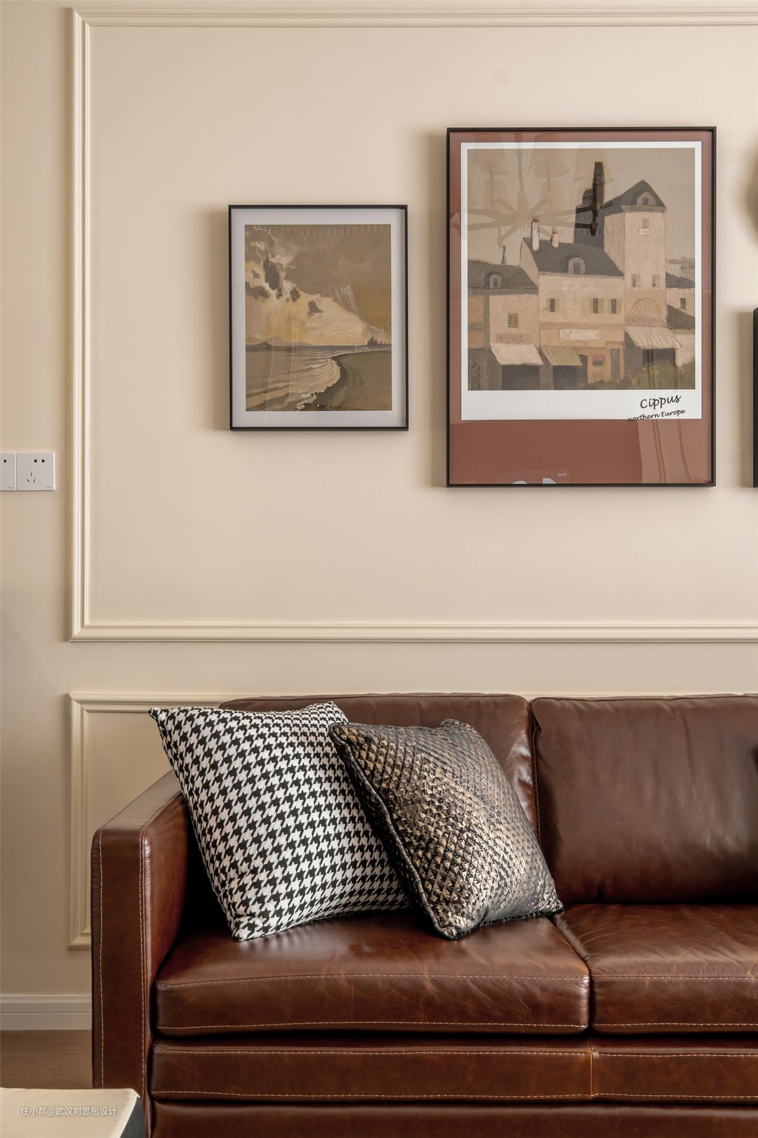 深棕色的沙发+千鸟格抱枕+百褶灯罩的落地灯,搭配黑白手绘花瓶和复古装饰画,为空间增添一抹俏皮古典韵味。