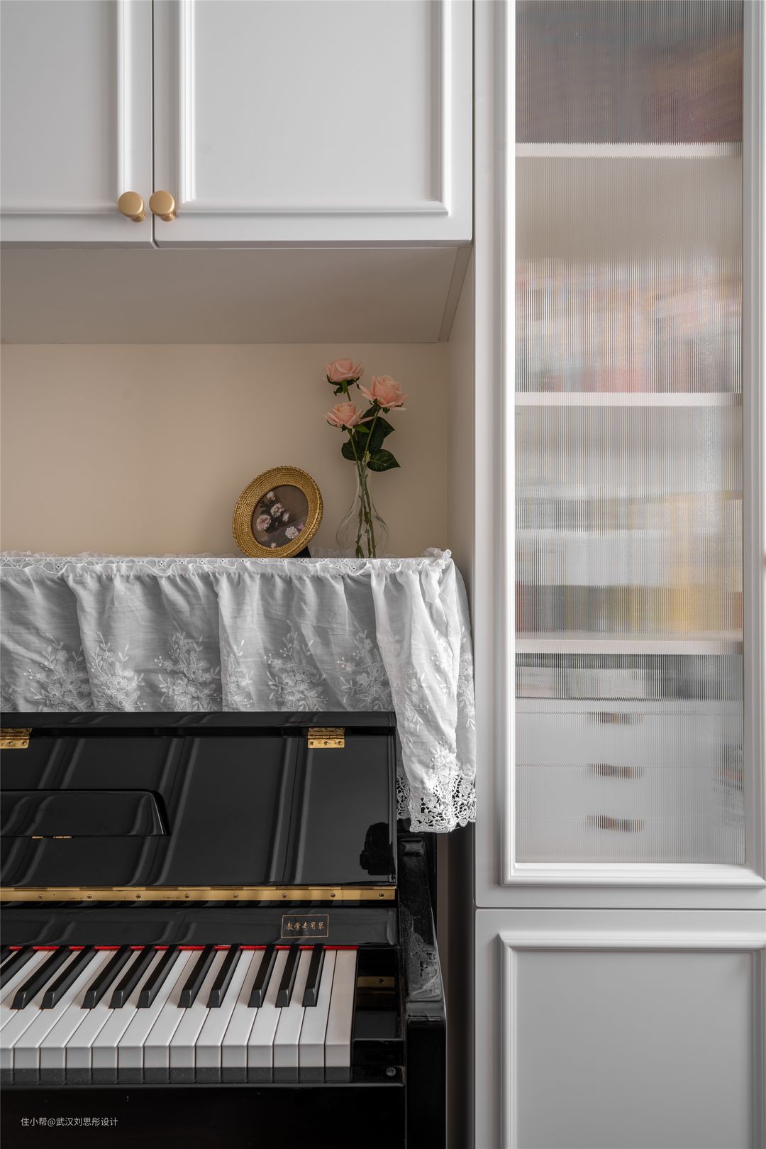书房门采用弧形门洞+皎洁的蕾丝门帘代替,颇具仪式感,奶油色的主色调以及深邃的钢琴,以及靠窗的书桌,让整个书房温馨又精致。