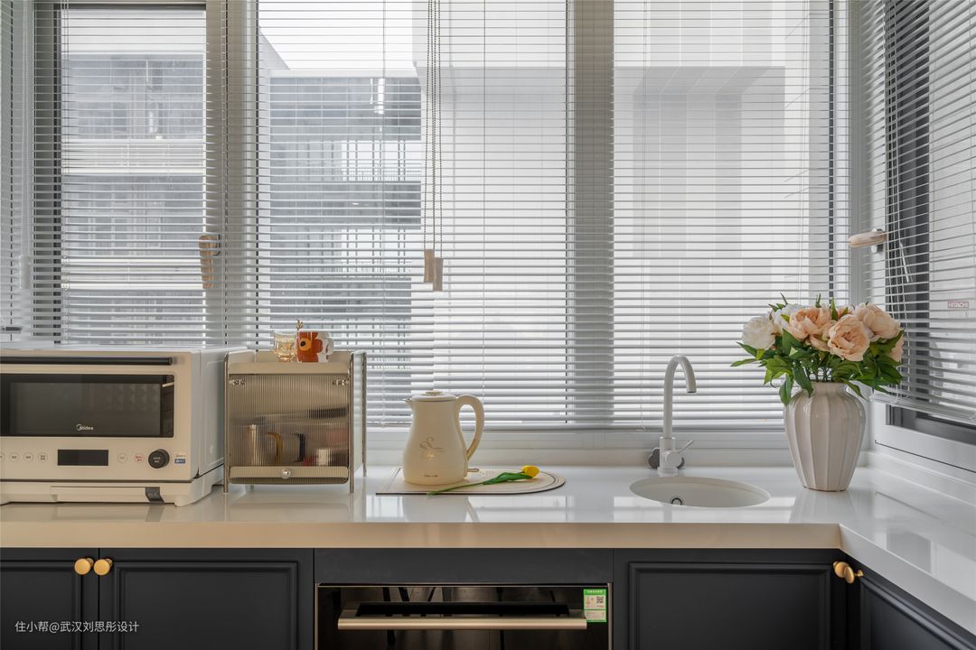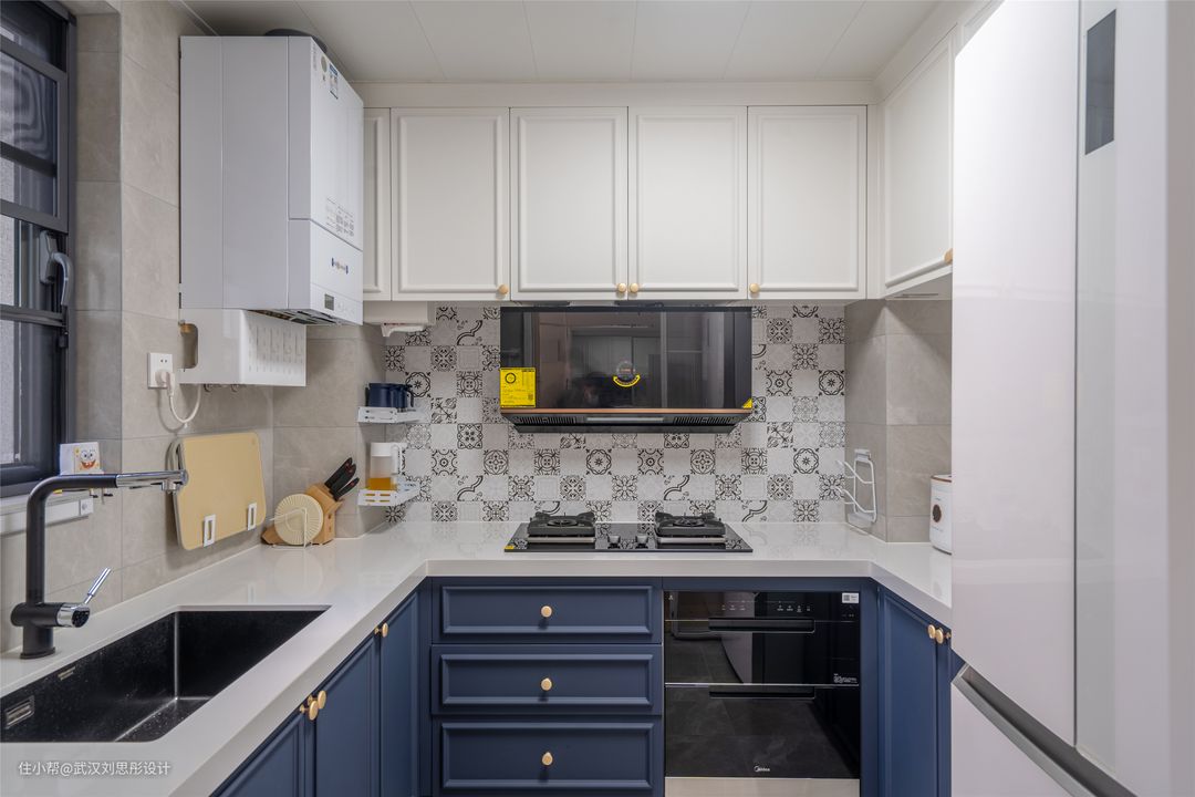#寻找1%的厨房 厨房选用了米色系瓷砖,复古的靛蓝色橱柜搭配黄铜色哑光拉手,白色的吊柜,复古而精致的小细节,被拿捏的恰到好处。