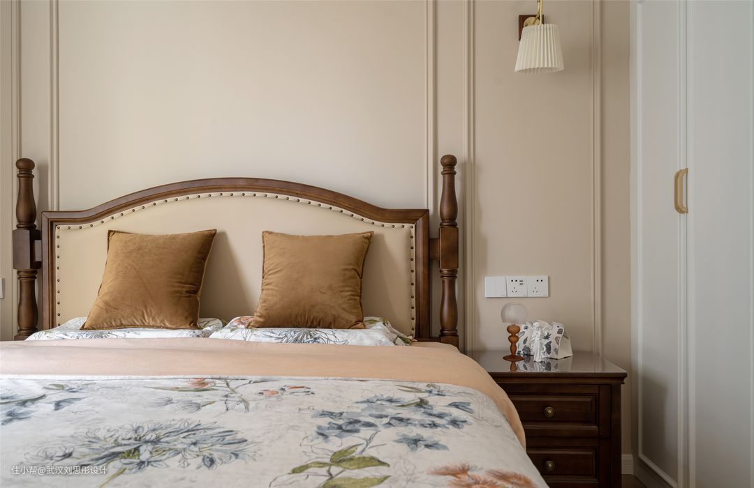 主卧延续复古的风格,也同样涂刷立邦魔术漆小羊皮系列的“荷兰乳酪”(荷兰乳酪NN3401-4),搭配深棕色枕头、同色床头柜,以及古铜金的床头壁灯,整体低调而优雅。床头背景墙用PU线作为装饰点,增加视觉效果的层次感。