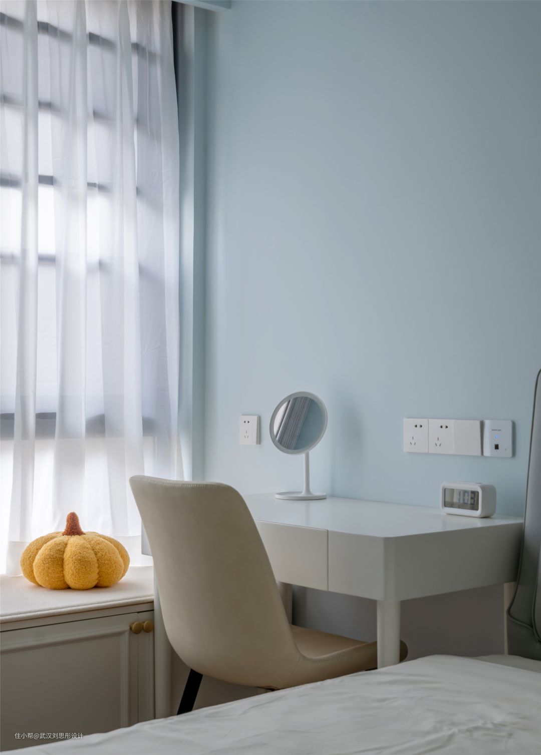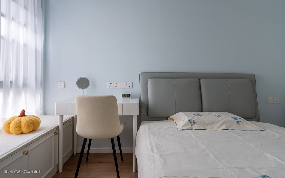 墙面以雅致的浅蓝色打底,同样选择立邦魔术漆小羊皮系列的“沁心冰蓝”(色号:沁心冰蓝BC0013-4),搭配柔美的白色窗帘,恰到好处的阳光轻柔地点拨舒适的白色床品,氤氲出一个女孩甜美梦幻的卧室空间。