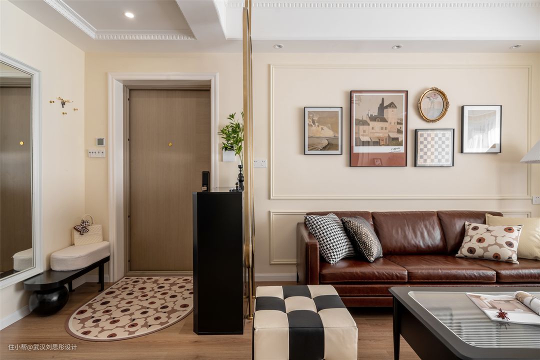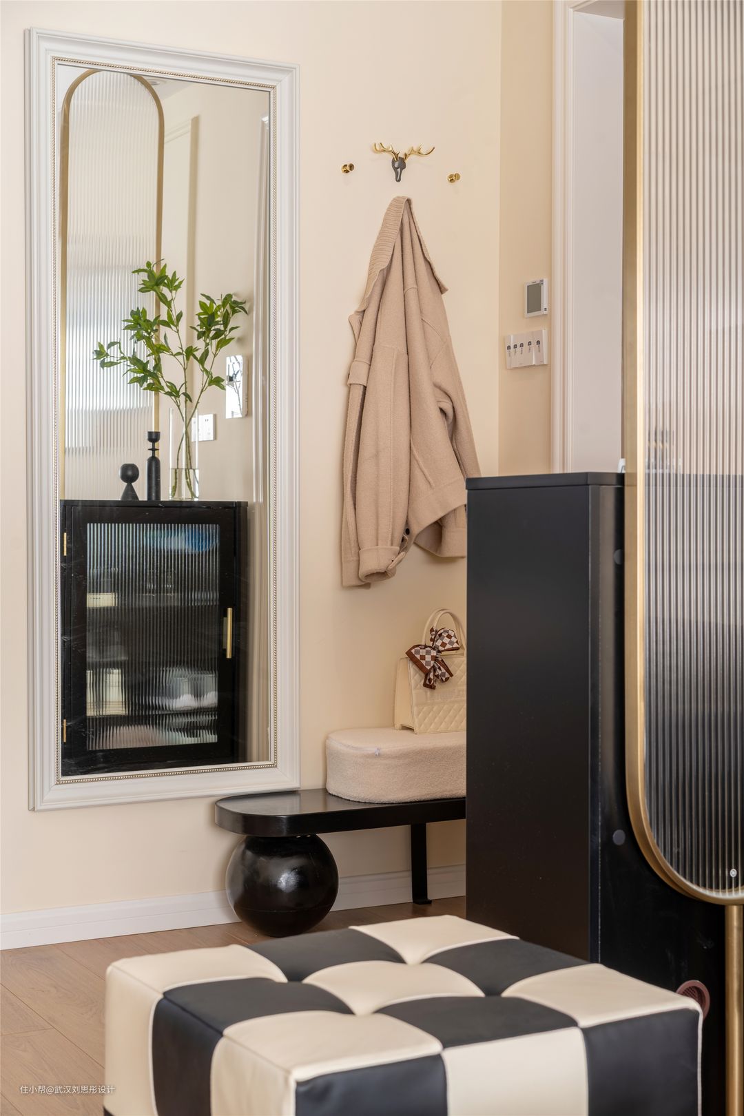 入户右边做了一面隔断,长虹玻璃的朦胧感和复古格调的深色鞋柜,可以将常用的鞋子摆放入内。玄关角落的极具高级美感的换鞋凳,搭配实用又精致的挂钩和穿衣镜,将回家的氛围营造的满满的。