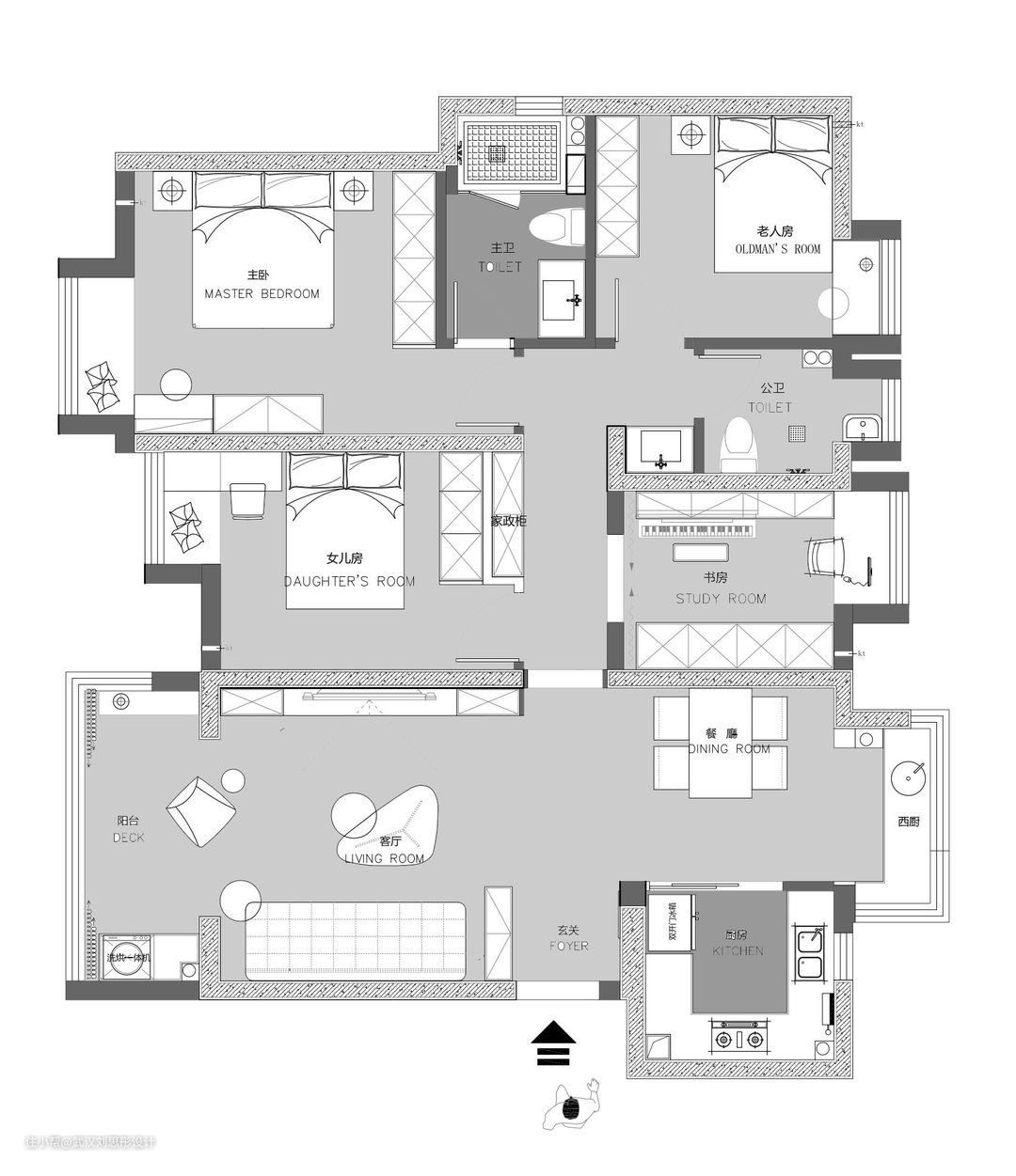 户型方正,南北通透,四房两厅一厨两卫,大的格局没有太多问题,屋主一家三口,考虑了未来的可变动性,希望保留多一点房间,喜欢温暖,带点复古的美式风格。